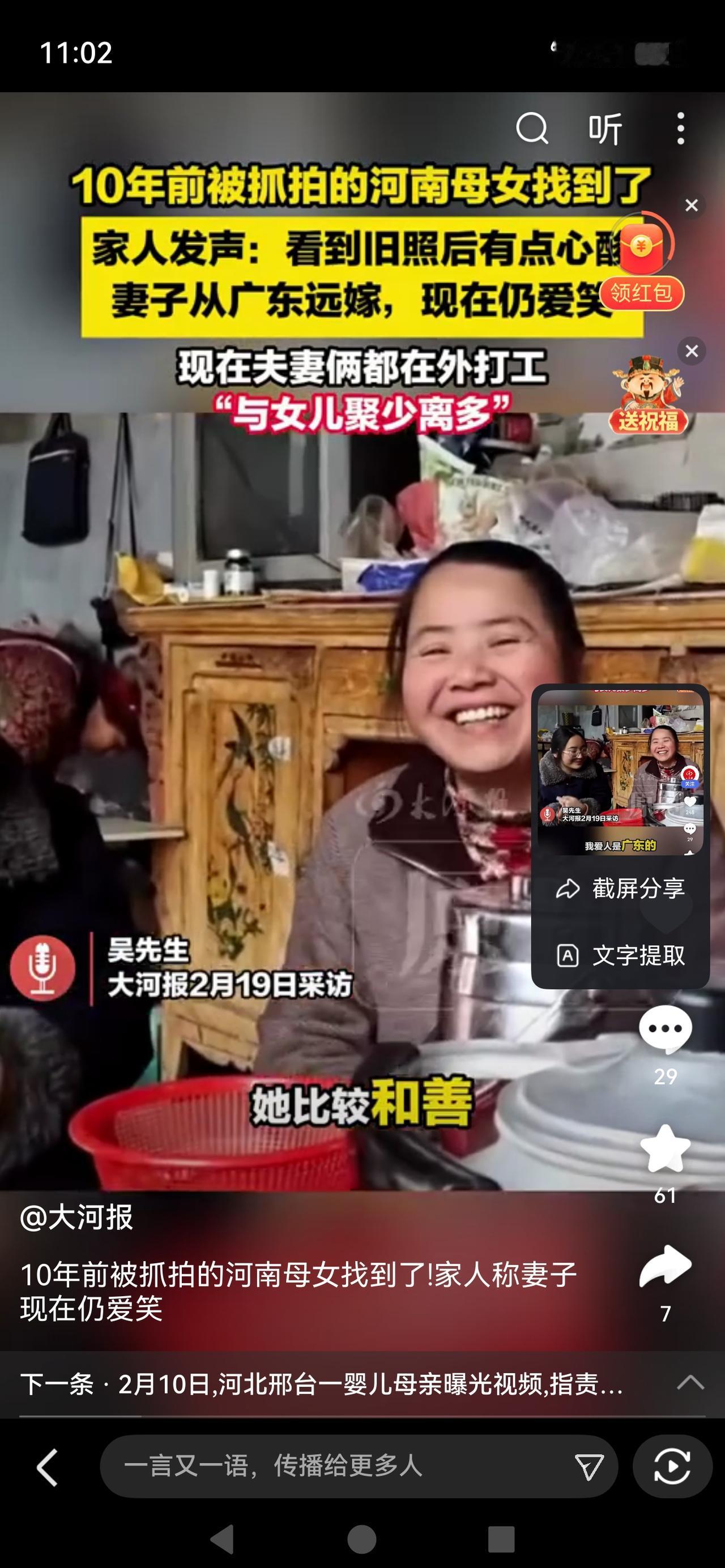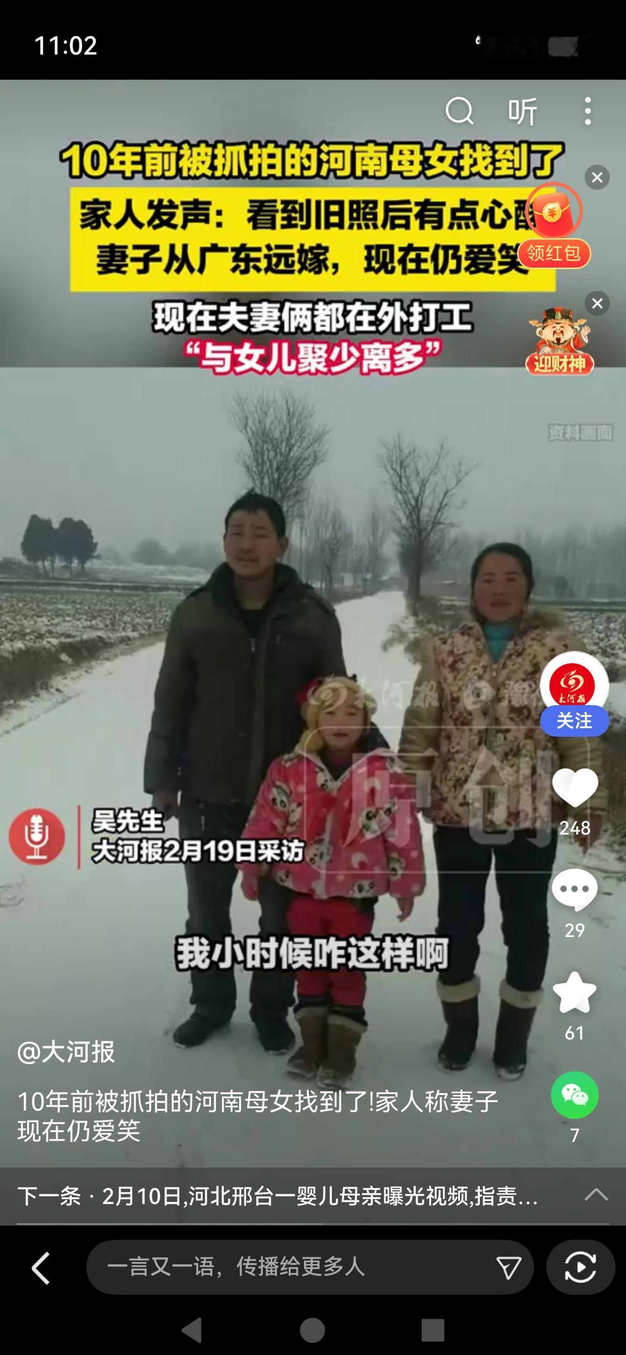 《10年前被抓拍的河南母女找到了!一张照片看哭全网:最动人的烟火,从来都在平凡里》 这张无意间拍下的照片,没有滤镜、没有摆拍,却在10年后戳中千万人的心。照片里,母亲挑着担子,牵着小小的女儿,一路走一路笑,阳光落在她们身上,普通得不能再普通,却温柔得让人挪不开眼。拍摄者无心寻人,全网网友热心接力,短短两天,这对河南驻马店的母女就被找到。 原来,母亲是从广东远嫁河南,当年正从香菇大棚干完活回家,挑着要洗的衣物,日子不算富裕,却把笑容挂在脸上。十年过去,女儿长大,母亲依旧爱笑,一家人安稳幸福。这张照片之所以爆火,不是因为惊天动地的故事,而是它照见了最真实的普通人:生活有辛苦,却从不缺温柔;日子有奔波,却始终心怀热爱。我们在她们身上,看到了自己的母亲、自己的童年,看到无数平凡家庭默默扛着生活、却把最好的情绪留给家人的模样。人间最治愈的,从来不是大富大贵,而是苦中带甜、笑着向前。 这哪是找一对母女,这是全网在找遗失的温柔与初心。没有狗血剧情,没有流量套路,仅凭最朴素的笑容与烟火气,就击穿了所有人的内心。远嫁的勇敢、持家的坚韧、陪伴的温暖,全都藏在这张旧照片里。它告诉我们:真正的幸福,从不轰轰烈烈,而是柴米油盐里的知足常乐,是风雨同行里的不离不弃。愿我们都能像这对母女一样,不管生活多难,始终面带笑容,把平凡日子过成光。热点话题 河南一对母女
