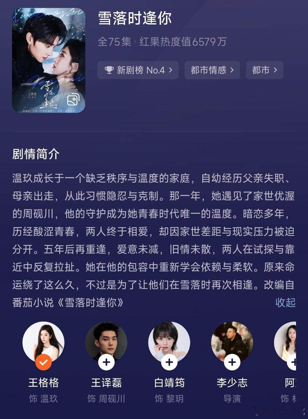 王格格的短剧雪落时逢你 预约了还没看,首日热度6579万,目前收藏50几万,这成绩是不是算一般?值得一看吗