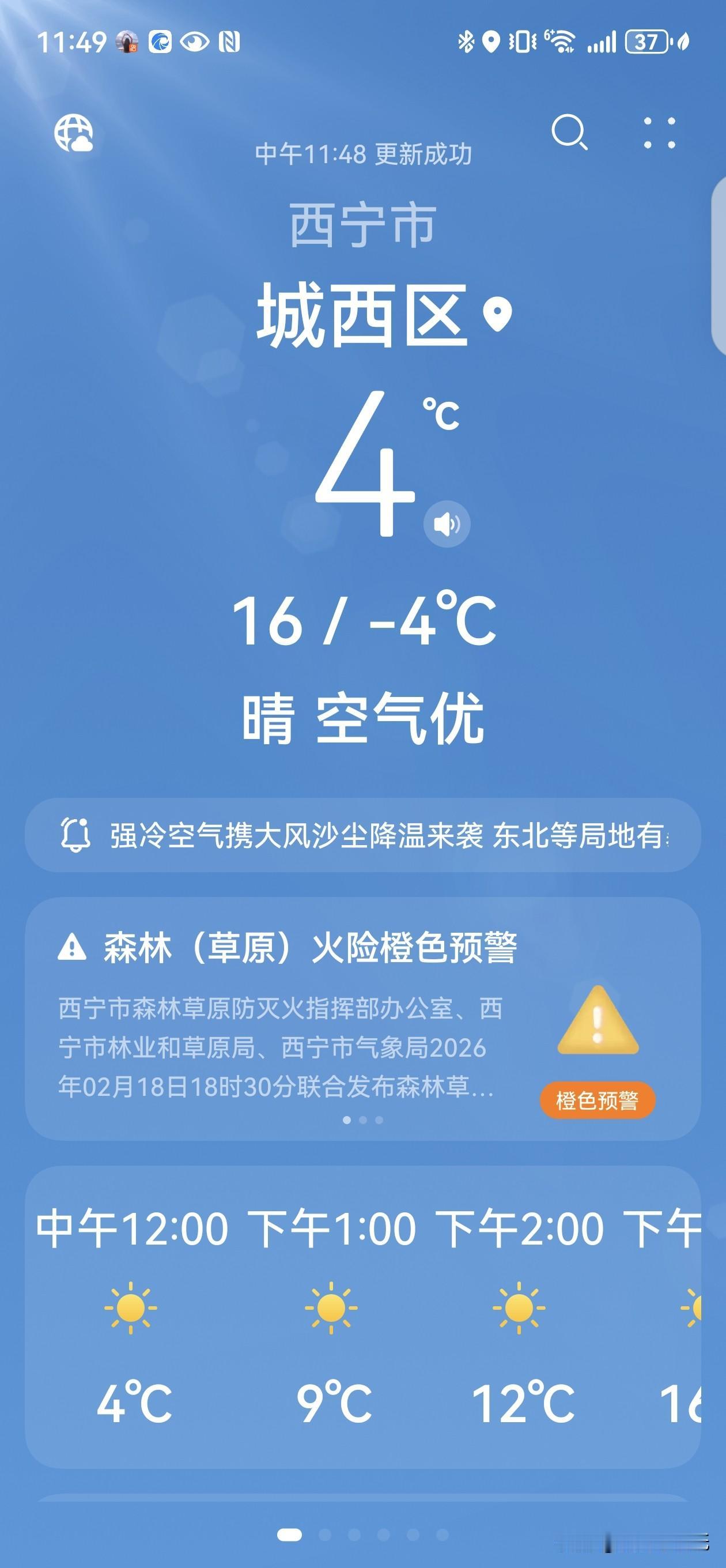 今天, 西宁最高气温将冲上15℃,这什么概念? 今天城西白天实况气温已升至4℃,体感并不算冷。抬眼望去,天空一洗如碧,蓝得令人惊艳。这般暖意让人恍然觉得,春暖花开、河边韭草短浸溪的日子已经不远了。 据预报,20日白天晴,偏西风3~4级,最高气温可达15℃;夜间晴,最低气温-3℃。21日白天仍为晴天,偏西风增强至5~6级,最高气温14℃;夜间风力减弱至3~4级,22日早晨最低气温-4℃。 天气虽好,却也伴随着阵阵吹风。整个冬天未曾降雪,气候持续干燥,对农民的田地和收成已造成影响。湟水河哗啦啦流淌,整个冬天都未封冻,这样的现象颇为反常。 眼下只觉得一天比一天暖,寒冷的时节,怕是快要结束了。 西宁 西宁天气实况 青海气象预报