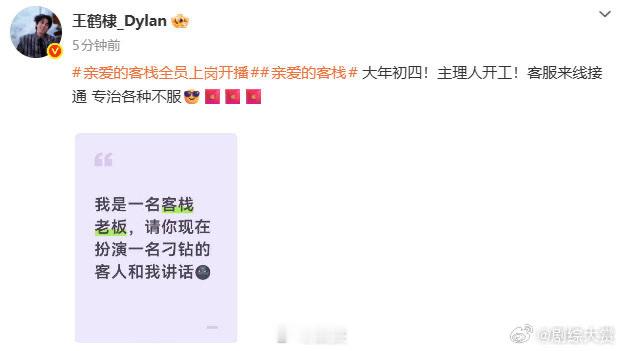王鹤棣王鹤棣大年初四开工大年初四开工超有干劲!王鹤棣在《亲爱的客栈》里认真负责又温柔细心,主理人魅力拉满,越看越喜欢~亲爱的客栈