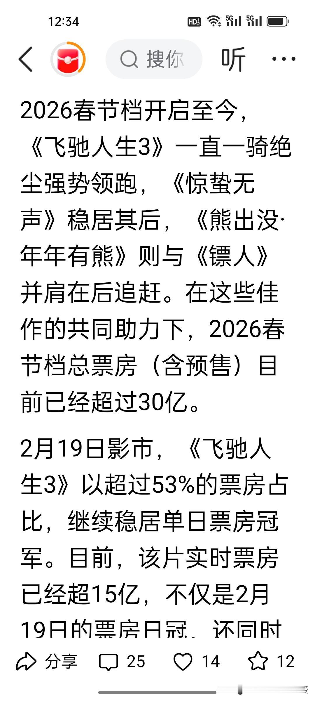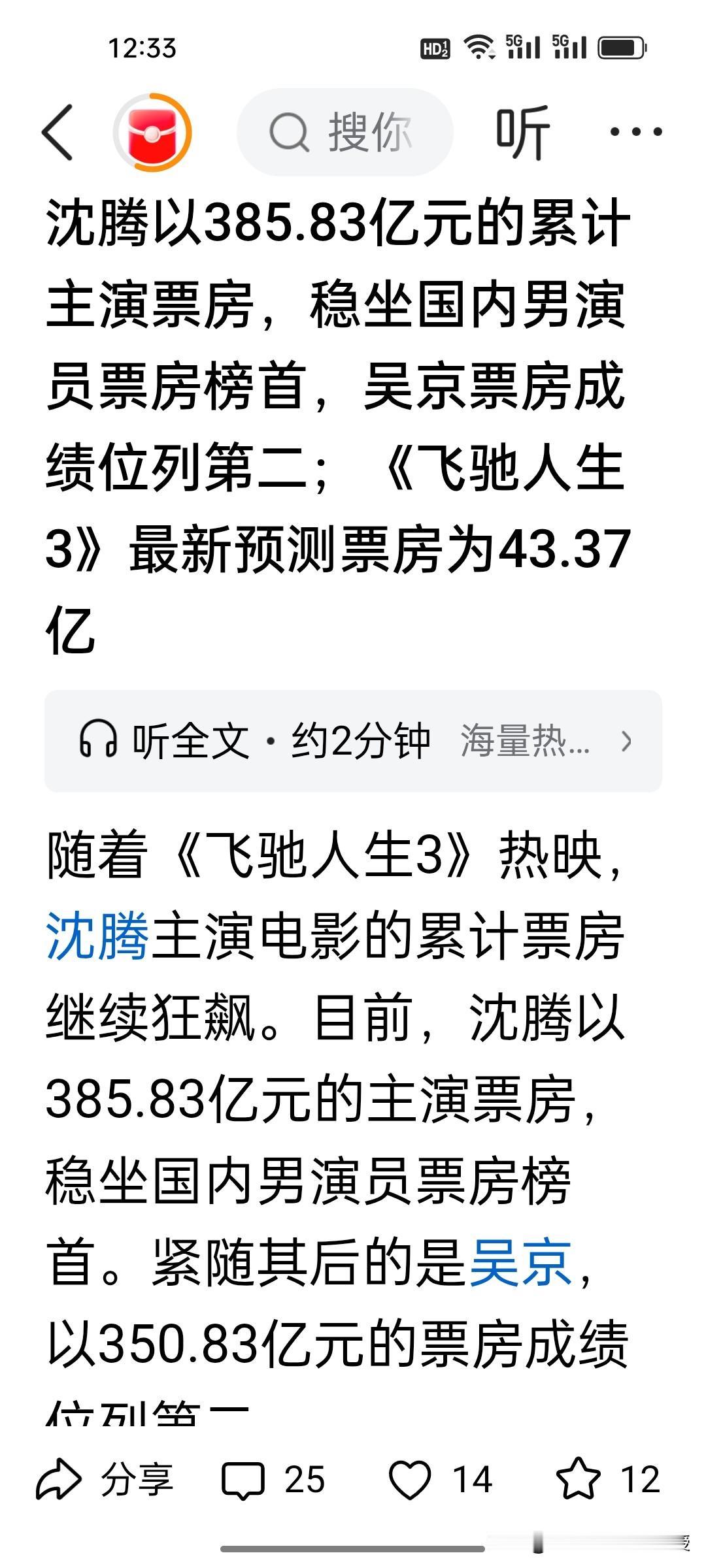 沈腾稳坐票房榜首,根本不是靠演技! 刚刚看到,沈腾已经凭借《飞驰人生3》荣登国内男演员票房第一,其实核心原因只有一个:顶级观众缘。和贾玲一样,他天生自带路人好感,过年大家图的就是开心放松,沈腾一出场,喜剧氛围直接拉满。这就是为什么之前贾玲春节档的两部片子能是票房第一,有王宝强的《唐人街探案》就非常火爆,是一样的道理。 沈腾早已不需要靠演技证明自己,甚至春晚偶尔忘词都成了独有的可爱特色,观众不仅不介意,反而更觉得真实接地气。男演员最值钱的从来不是颜值和演技,而是独一无二的个性标签。 沈腾的喜剧人标签,从《西虹市首富》就已经奠定,这就是春节档最强票房保障。过年就是图快乐放松,沈腾的喜剧人形象完全贴合观众的心理,这才是他成为票房保障的真正底气。