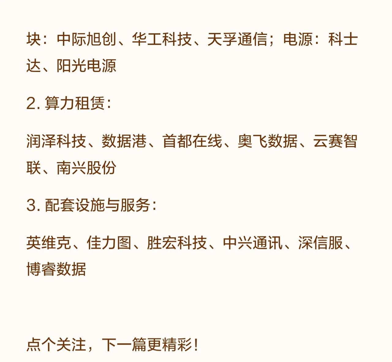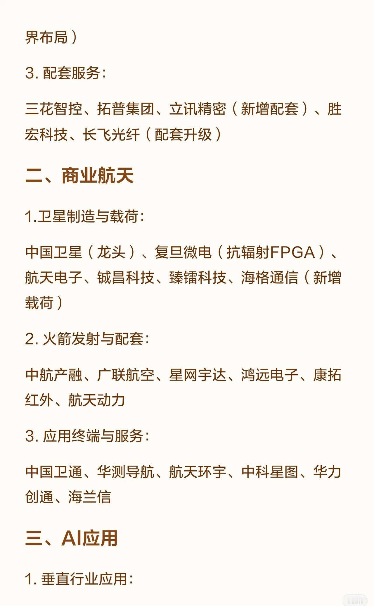 节后市场六大科技投资方向及相关代表公司,要点如下: 1. 人形机器人: - 核心零部件:减速器(绿的谐波等)、电机(汇川技术等)、传感器(奥比中光等)。 - 整机制造:美的集团、新时达、埃斯顿等。 2. 商业航天: - 卫星制造与载荷:中国卫星、复旦微电等。 - 火箭发射与配套:中航产融、广联航空等。 - 应用终端与服务:中国卫通、华测导航等。 3. AI应用: - 垂直行业:办公(金山办公)、医疗(卫宁健康等)、金融(同花顺等)、营销(蓝色光标等)、政务(数字政通等)。 - 大模型与算法:科大讯飞、三六零、寒武纪等。 - 终端硬件:海康威视、大华股份等。 4. 化工: - 一体化龙头:荣盛石化、恒力石化、万华化学等。 - 特种化工与新材料:楚江新材、光威复材等。 5. 太空光伏: - 核心材料与器件:云南锗业、赛伍技术等。 - 电池制造:隆基绿能、东方日升等。 - 系统集成与运维:上海港湾、航天宏图等。 6. 算力: - 算力硬件:服务器(浪潮信息、工业富联等)、光模块(中际旭创、华工科技等)。 - 算力租赁:润泽科技、数据港等。 - 配套设施与服务:英维克、佳力图等。