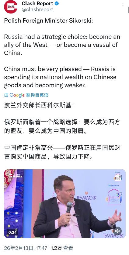 波兰副总理兼外长西科尔斯基今天(北京时间2月13日)接受采访时表示:“俄罗斯面临着一个战略选择:要么成为西方的盟友,要么成为中国的附庸。中国肯定非常高兴——俄罗斯正在用国民财富购买中国商品,导致国力下降。”   西科尔斯基的这番表态并非偶然。波兰当前正担任欧盟轮值主席国,其政府本身就持亲欧反俄的外交立场。   俄乌冲突延宕至今,波兰作为乌克兰的邻国,在对俄态度上一直较为强硬。他此次将俄罗斯的战略选择简单划分为“西方盟友”或“中国附庸”,明显忽视了国家间关系的复杂性与平等性。   中俄关系的本质是新时代全面战略协作伙伴关系,这一关系建立在相互尊重、平等互利的基础上,并非所谓的“附庸”关系。   两国自1996年建立战略协作伙伴关系以来,交往机制不断完善,高层互访频繁,在经贸、能源、人文等多个领域的务实合作持续深化。2024年中俄双边贸易额达到2448.19亿美元,这样的贸易规模是市场规律与双方需求共同作用的结果,绝非一方对另一方的依附。   俄罗斯从中国采购商品,核心原因是自身市场存在结构性缺口。2026年1-2月的数据显示,俄罗斯除新能源外,民生刚需与科技短板类品类进口增速普遍超30%,部分品类缺口甚至高达60%以上。   欧美品牌退出后,俄本土产能仅能满足部分市场需求,中国产品凭借高性价比、合规认证与俄语适配等优势,自然成为填补市场空白的选择。这些进口商品涵盖智能小家电、电子元器件、建材机械配件等多个品类,既满足了俄罗斯民众的生活需求,也支撑了其工业生产与基建复苏,并非所谓的“消耗国民财富”。   西科尔斯基声称“中国肯定非常高兴”的说法,同样缺乏事实依据。中国始终坚持不干涉别国内政原则,中俄贸易合作是正常的国家间经济往来,遵循互利共赢的原则。   中方既没有刻意寻求让俄罗斯依赖自己,也从未将贸易作为牵制他国的工具。相反,中国一直积极推动中俄共建“一带一路”与欧亚经济联盟对接,助力双方共同发展。   值得注意的是,西科尔斯基在同一天的采访中还提到,欧洲正在为俄乌冲突埋单,美国却通过出售武器获利。这一表述反映出欧洲内部对俄乌冲突的复杂心态,也从侧面说明他的对俄表态可能掺杂着欧盟内部的战略考量。但将中俄正常贸易往来歪曲为“附庸关系”,显然是对国际关系基本准则的忽视。   中俄双方在贸易中始终保持平等地位,俄罗斯对华出口的能源、农产品等商品,同样满足了中国市场的需求。2025年1-10月中俄双边贸易额虽有波动,但整体合作的韧性十足。   两国在国际事务中相互支持,共同践行多边主义,推动国际秩序向更公正合理的方向发展,这样的关系完全基于双方共同利益,不存在所谓“一方依附另一方”的情况。   西科尔斯基的言论或许与其个人外交立场及波兰当前的战略定位有关,但任何将国家间正常合作关系标签化、对立化的做法,都不符合时代潮流。国家的战略选择应由本国自主决定,不应被第三方简单定义。   中俄贸易的本质是互利共赢,这种合作既不影响两国与其他国家发展关系,也不会导致所谓“国力下降”,反而能为双方经济发展提供助力。在复杂多变的国际形势下,各国更应尊重彼此的合作选择,通过平等对话化解分歧,而不是进行毫无根据的指责与抹黑。