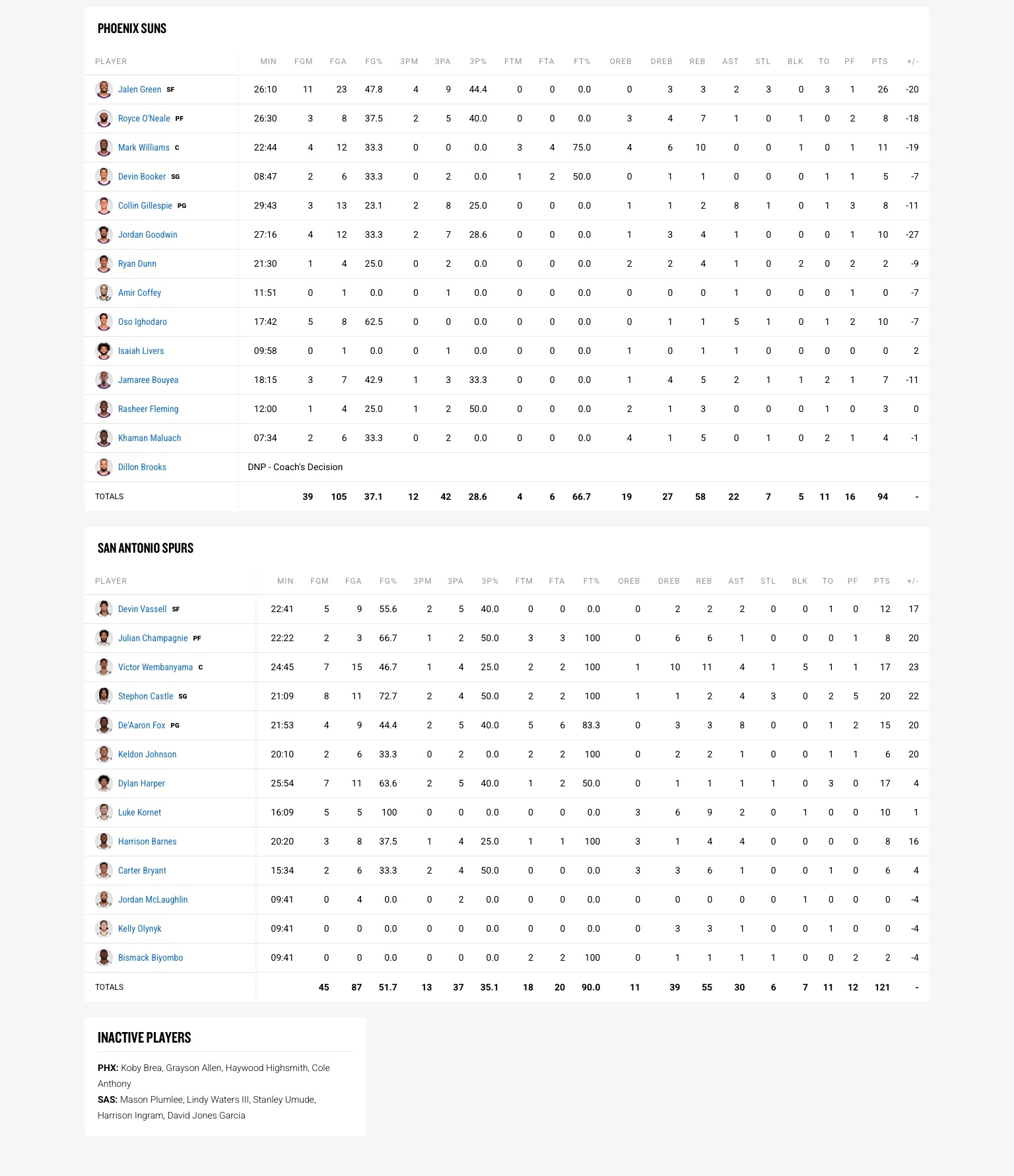 马刺(39-16):卡斯尔20分2板4助3断、文班亚马17分11板4助5帽、哈珀17分1板1助、福克斯15分3板8助、瓦塞尔12分2板2助、科内特10分9板2助、尚帕尼8分6板1助、巴恩斯8分4板4助、布莱恩特6分6板1助、凯尔登6分2板1助、比永博2分1助、奥利尼克3板1助、麦克劳林1板