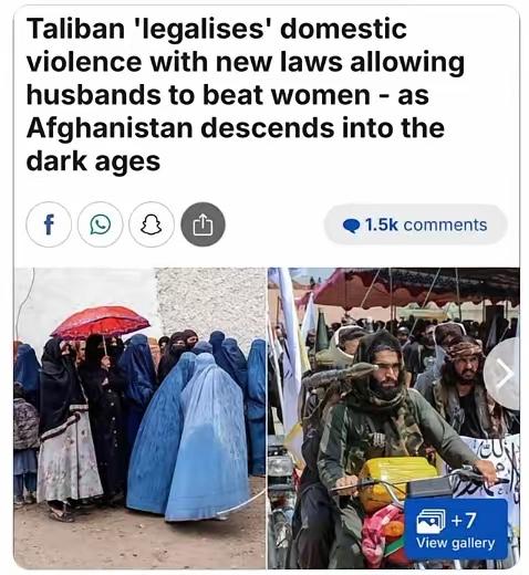 【塔利班通过一项法律,允许丈夫殴打妻子——《每日邮报》】阿富汗通过了一项新法典,允许家庭内部发生肢体暴力,只要不造成严重伤害即可。如果该女子遭受严重伤害,该男子可能面临最高15天的监禁。妇女也被禁止向父母寻求庇护;如果她们经常未经丈夫许可试图离家出走,可能会面临最高三个月的监禁。 看到这样的消息,说实话,心里发凉。家,本该是最安全的地方,是躲风避雨的港湾。可一旦连家里都能被“合法”动手,那还有什么退路可言? 所谓“不造成严重伤害”,听上去像是留了余地,实际呢?什么叫严重,谁来界定?打到什么程度才算越线?现实生活里,很多伤不一定流血,却会在心里留下阴影。法律如果给了模糊空间,受伤的往往是更弱势的一方。 更让人难以接受的是,连向父母寻求庇护都被限制。一个人遇到暴力,本能就是逃离、求助。连这条路都被堵上,等于把人困在围墙里。婚姻成了枷锁,而不是互相扶持的关系。 家庭暴力从来不是“家务事”。它关系到最基本的尊严和安全。世界很多地方都在努力加强对家暴的惩罚和干预,希望用法律给弱者撑腰。现在却出现反向的信号,这种变化难免引发担忧。 有人会说,这是当地的制度安排,是他们的社会背景决定的。文化背景确实复杂,可无论在哪,暴力都不该被默许。人和人之间的相处,靠的是尊重,而不是拳头。把伤害写进条文里,很难让人安心。 这样的规定,对女性意味着什么?意味着风险提高,意味着维权更难,也意味着沉默可能会变成常态。长远来看,社会的裂痕只会更深。家庭不稳,社会也难稳。 看新闻的时候,或许我们只是隔着屏幕叹口气。可对身处其中的人来说,那是每天都要面对的现实。法律本该是保护伞,而不是压在头顶的阴影。 阿富汗新政