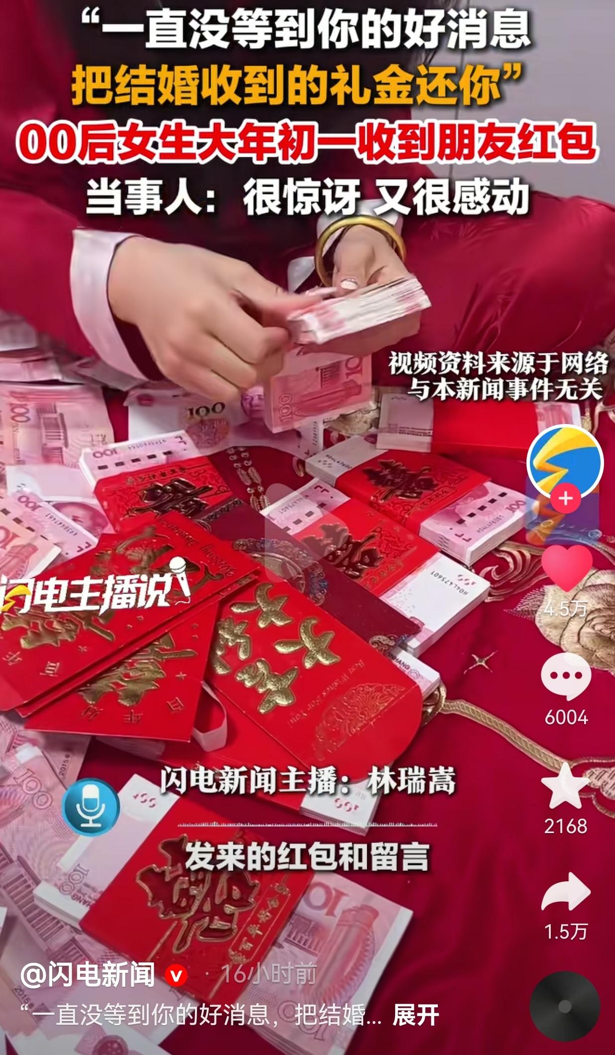 这才是人间清醒!大年初一,cici正窝在沙发上抢红包,手机突然弹出来一条微信转账,备注看得她当场鼻子一酸:“鉴于我结婚两年,一直没等到你的好消息,新年把礼金还你。祝你平安喜乐,勇敢做自己,去见喜欢的人,看好看的风景。” 转账金额是600块,不多不少,正好是两年前cici随给她的份子钱。 说实话,她从来没想过这笔钱还能收回来,毕竟在很多人的眼里,随出去的份子钱就像泼出去的水,哪有再要回来的道理。 发消息的不是cici从小一起长大的发小,而是她实习时的同事阿柚。她们在同一家公司共事了半年,那时候她们天天一起点奶茶、吐槽老板,下班路上分享对未来的憧憬。 后来cici换了城市,阿柚也换了工作,她们的联系渐渐少了,从每天聊天变成了逢年过节的一句问候,再后来,连朋友圈点赞都成了奢侈。 cici以为,她们的友情会被时间和距离冲淡,甚至会像很多同事那样,慢慢变成通讯录里的一个名字。 可她偏偏在大年初一,用这样一种温柔的方式,把那份“人情债”还给了cici。收到红包的那一刻,cici整个人都懵了,除了惊讶,更多的是说不出来的感动。 网友看到后评论说:“这朋友也太神仙了吧!我随出去的份子钱,都快成坏账了。” 也有的网友说:“我结婚的时候,闺蜜随了800,现在她还单着,我都不敢提这事儿,怕她觉得我在催婚。” 还有的网友说:“我随了500给大学同学,结果人家转头就把我删了,这钱就当喂狗了。” 其实大家都懂,随份子钱从来不是“你给我多少,我还你多少”的交易,可现实里,太多人把它当成了“人情投资”。 你结婚我随500,我结婚你就得还600,不然就是“不懂事”;你生孩子我包200,我孩子满月你就得回300,不然就是“没诚意”。 可阿柚的做法,却戳破了这层虚伪的窗户纸:“我结婚的时候,你给我的是祝福,不是欠条。现在你还没遇到想嫁的人,我不想让这份祝福变成你的压力。” 她没有说“你快找个人嫁了吧”,也没有说“我都当妈了你还单着”,而是用600块钱告诉cici:你的人生节奏,不用跟着别人走。 她们这代人,从小被教育“人情大于天”,随份子、走亲戚、随大流,好像不这么做,就是“不合群”。可现在,她们终于开始学着说“不”了: 不随不想随的礼,不结不想结的婚,不活在别人的期待里。 阿柚退份子钱的举动,本质上是在说:“我尊重你的人生选择,也希望你别被世俗绑架。” 大家觉得呢?欢迎评论区唠唠。