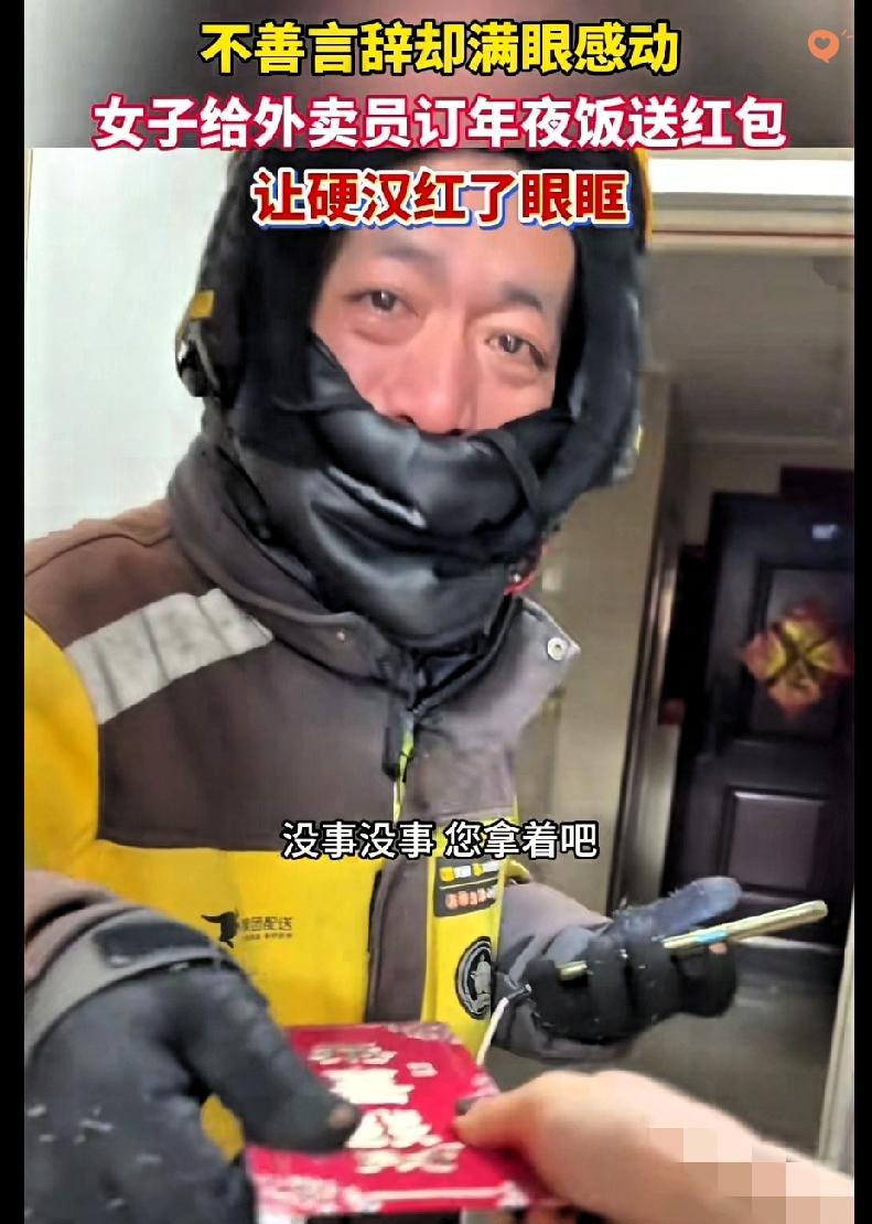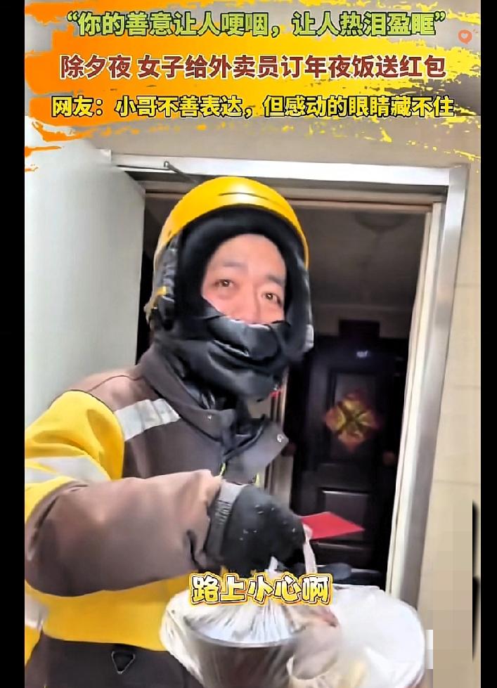 除夕这一幕直接看哭无数人,河北这位女子的做法,才是过年最该有的样子! 万家团圆的除夕夜,很多外卖小哥还在寒风里奔波,没法和家人吃顿热乎饭。 这位女子点外卖时,顺手也给骑手准备了一份年夜饭,还贴心包了红包。 小哥接过时整个人都愣住了,不善言辞的他,眼里的惊喜和感动根本藏不住。 这不是什么大手笔,却是最戳心的温柔。 真正的善良从来不是作秀,而是看见别人的辛苦,愿意伸手拉一把、暖一下。 一顿热饭、一句祝福,就能让奔波的人瞬间破防。 人间最珍贵的,从来都是这份双向的温柔与体谅。 你有没有在过年时被陌生人暖到过?来评论区说说~