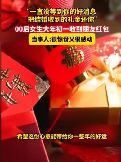 “特殊的新年礼物!”女子大年初一,居然收到一个特殊的红包,一个许久未联系的前同事,给她发来了留言和这个红包,前同事说,她已经结婚两年了,都没有收到女子的好消息,现在她把结婚时女子随的礼金,以特殊红包的方式,返还给女子,女子又意外又感动。 大年初一,随着鞭炮噼里啪啦地响,女子睡醒了,她习惯地打开手机,突然屏幕闪出一个红包,让她很震惊。 一个许久未联系的前同事,居然给她发红包了,她感到太意外了,自从两年前,两人同事了半年,就慢慢失去了联系,女子甚至都已经想不起这个同事来了。 前同事为何无缘无故,给她发来红包呢?女子很意外,打开了这个红包。 只见红包的数额,正是当时前同事结婚时,她随着礼金,她一下子明白过来了。 果然前同事发来了一段,让她感动又暖心的留言。 她说:“我们已经结婚两年了,一直都没有收到你的好消息,现在趁着大年初一,我们把你的礼金当做红包,作为新年的特殊礼物,返还给你,她通过这样的方式,祝福女子,让这份美好的心意,给女子带来一年的好运,让女子能够找到属于自己的幸福。 女子看到这段留言,前同事的形象浮现在眼前,往事的一幕幕,又回到了她的脑海里。 当时,女子和前同事都是实习同事,所以共事的时间不长,才半年时间,可能是大家都是实习同事,那时候都是真诚以待,那一段工作的时光,女子觉得很美好。 就在那段时间,前同事结婚了,作为同事,女子当然要随一份礼金,这份礼金随出去,女子就没有想过要收回,就算自己结婚,她觉得前同事,也不可能来参加她的婚礼,大家都那么久没联系了。 毕竟半年之后,她们的实习结束了,她们也离开了实习的单位。 当她们不再成为同事,她们联系的纽带也就没有了,后来她们也就慢慢地失去了联系,随出去的礼金,更加没有机会收回了,当然女子也没有想过要收回礼金。 可现在,这份礼金以特殊红包的方式,回来了,伴随着一份美好的心意。 看到这个特殊的新年礼物, 看到那美好的心意,女子感到内心暖呼呼的。 其实她和前同事在乎的可能不是这份礼金,前同事主动在大年初一,这个美好的日子里,以红包的形式,返回给女子,或许她就是想在大年初一,给女子一份美好的祝福。 女子也正是结婚生子的年龄,前同事肯定也是希望,她能够找到一个可以相伴一生的人。 正是这份美好的祝福,这份特殊的新年礼物,女子和前同事的这份情谊难能可贵,两人也因为这份特殊的新年礼物,重新热络起来。 对于女子遇到的这件暖心的事情,有人觉得,女子的前同事真的很讲究,她结婚的时候,虽然收了前同事的红礼金,但她从来没有忘记这份情谊。 她在过年这个美好的日子,以红包的形式将礼金返还给女子,带着一份美好的祝福,让女子既能接受又能暖心,这真的是用心了。 但有人却觉得以这样的形式返还礼金,是否就是不想联系了,毕竟两人只是前同事,后面又没有联系,如果以这样的形式返还礼金,反而适得其反。 这就要看当事人是怎么想的了,女子觉得这是非常暖心的,又因为这个特殊的新年礼物,重新和前同事有了联系,两人的感情也重新好起来,这份特殊的新年礼物就有意义了。 在当事人看来,这份特殊的新年礼物不是不来往了,而是让她们俩重新维护两人之间的美好情谊。 本来在结婚的这种美好的日子里随礼金,这是约定俗成的习俗,随出去的礼金,这属于一种赠与,一种美好的祝福,一般的人都没有想过要返还的。 《民法典》第660条规定:经过公证的赠与合同或者依法不得撤销的具有救灾、扶贫、助残等公益、道德义务性质的赠与合同,赠与人不交付赠与财产的,受赠人可以请求交付。 现在前同事在大年初一这个美好的日子,返还礼金,这也可以算是懂礼数的一个行为,并非是不再来往了。 那么你对这个特殊的礼物有何看法呢?