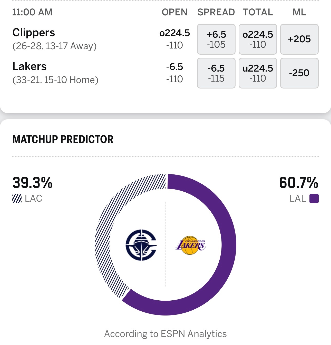 【比赛预告】明天11点,常规赛第55场,湖人主场迎战快船,ESPN预测湖人胜率60.7%。