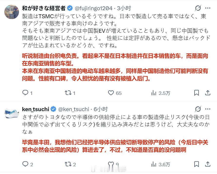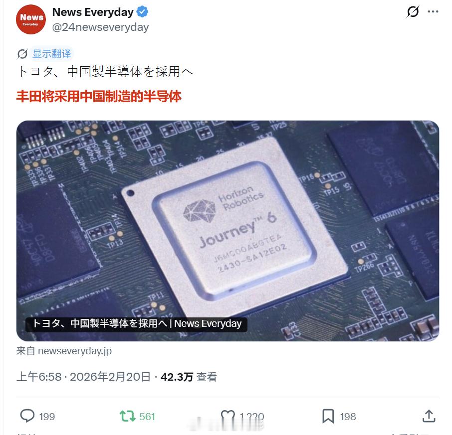 日本媒体:丰田将采用中国生产的半导体。报道称,丰田汽车与铃木将在中国以外市场销售的车型中,采用中国车载半导体新兴企业 ——地平线机器人公司(Horizon Robotics) 生产的 SoC(System on a chip 单片系统)。此前车载芯片主流均从日、美、欧厂商采购,在中国以外市场采用中国产芯片属于罕见举措。成本竞争力强,且质量达标似乎是做出这一决定的关键原因。随着中国汽车出口扩大,与日系车正面竞争场景增多,日方判断:若不采用中国产半导体,将难以在竞争中取胜。此举有望成为车载半导体战略的转折点。