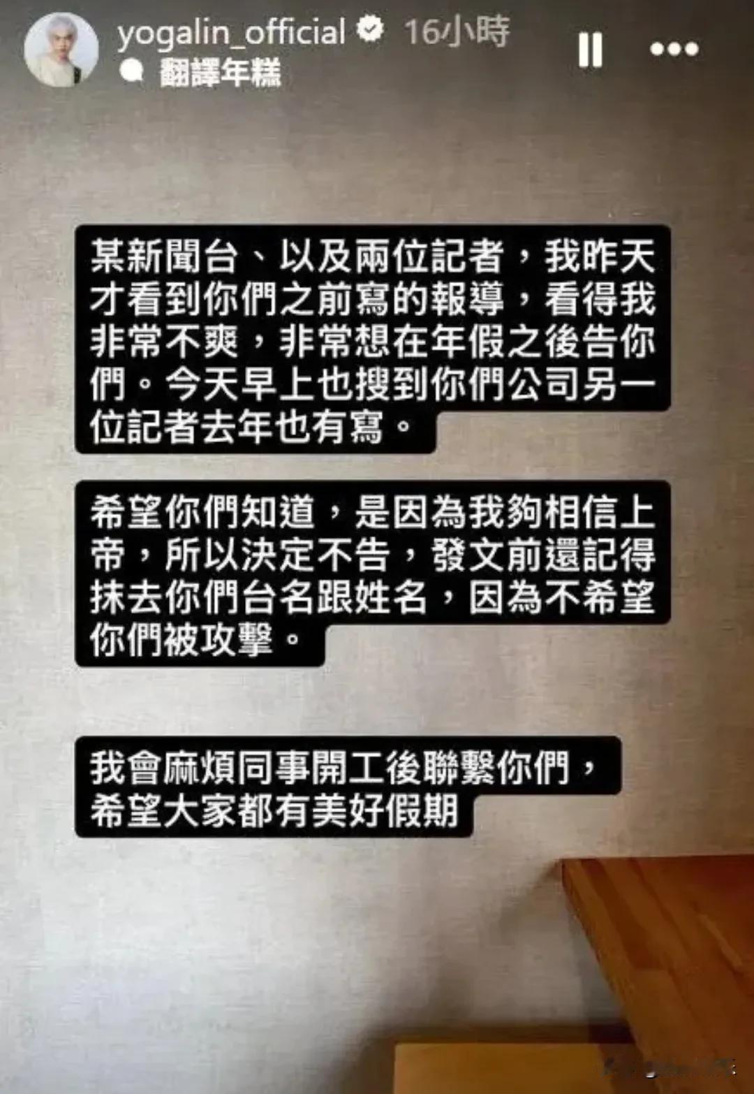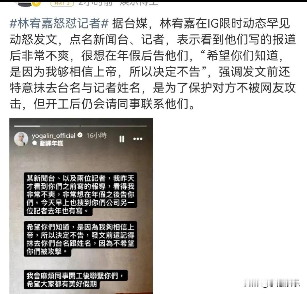 林宥嘉,罕见发飙! 林宥嘉罕见“发飙”却因信仰放下怒火:有些底线,是留给体面的 2月19日,一向温和的林宥嘉突然在社交平台开腔了,甚至可以用“发飙”来形容 。 这一次,他直接点名了记者和新闻台。原因很简单:因为邓紫棋即将开唱,某些媒体又习惯性地把那份早已翻篇的旧恋情拿出来翻炒,甚至用上了极具煽动性的字眼 。林宥嘉看完后直言“非常不爽”,甚至透露原本年假结束后第一件事就是提告 。 但真正让人动容的,是他接下来的处理方式。 因为信仰,他选择了暂时不起诉。他说,之所以在发动态前抹去了媒体和记者的名字,是因为“不希望他们被网民攻击” 。哪怕自己受了委屈,他依然在替对方留余地。但他也明确表态:开工后,会让同事对接处理 。 这才是成年人的处世之道:我可以因为信仰选择原谅,但我的底线依然清晰;我可以不让怒火蔓延,但不代表这件事就这么过去了。 随后他引用圣经的一句话:“总要尽力与人和睦相处……不要私自报复。” 这大概就是一个有温度的人,在面对冒犯时,最体面的回应吧。