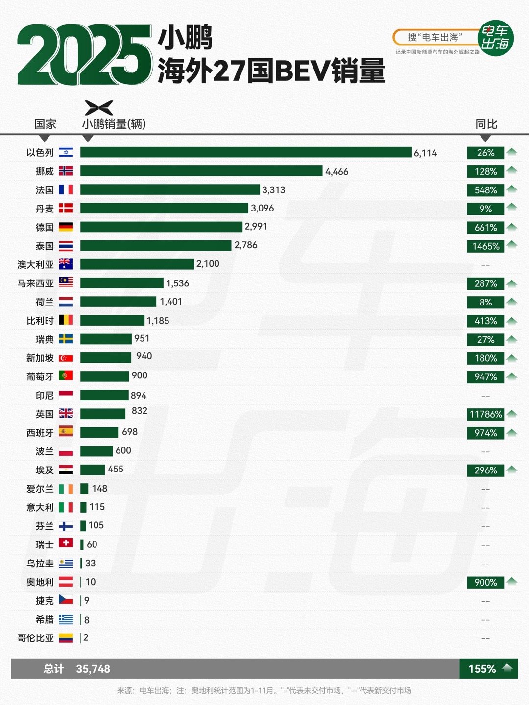 总销量35748辆,同比涨155%,看着挺唬人,可全球车市多大盘啊?这点量,也就够给传统豪强们塞个牙缝。 ​ 以色列卖了6114辆,占了总销量快1/5 ​ 欧洲增速确实吓人,德国661%、英国11786%,可基数低到可怜啊!德国全年才不到3000辆。 ​ 泰国1465%的增速看着猛,可全年才2786辆,这叫“爆发式增长”?怕不是去年只卖了18辆吧? ​ 27个国家里,一大半销量还没破千,哥伦比亚才2辆。