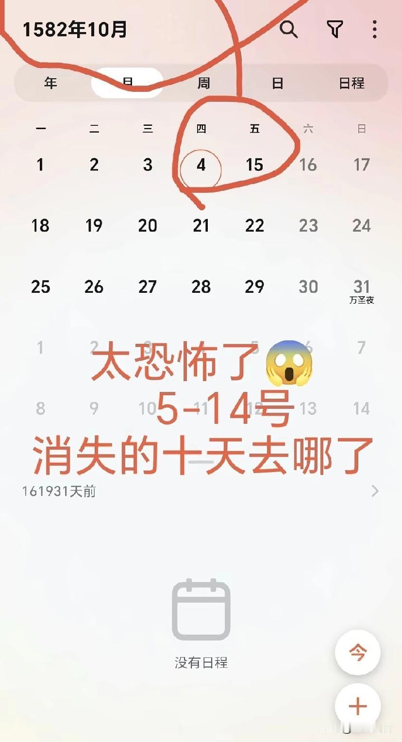 太恐怖了,5-14号消失的十天去哪里了?特意再次去翻了一下,农历却刚好接下去的 问了一下豆包,豆包的回答:1582年10月少了十天,是因为当时使用的儒略历与地球实际公转周期存在误差,罗马教皇格里高利十三世进行了历法改革,直接从10月4日跳到10月15日,中间的10天被删除。 公元3000年前人家就有一月大约29.5天的日期实行了,老祖宗说的对,非我族类其心必异,蛮夷是教化不了的。还是咱们老祖宗厉害。咱们农历就不会丢失10天 不过是历法比较低端,多年的积累已经对不上账了,他们没有平账大圣只好赤裸裸的写出来。像我们的历法就没有这个弊端,万年历,可不是只嘴说说的万年历,而是真·万年历,能用一万年都不会错的历法。