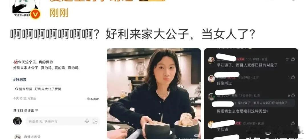 大瓜曝光! 从“罗总”到“罗昊子”:好利来大公子点赞女装评论,这一次他选择了做自己 如果说以前的罗昊是穿着西装、坐在好利来帝国里的“霸道总裁”,那20日刷屏的这组照片,他简直像是直接按下了人生的“重启键”。 镜头里的他,烫着温柔的卷发,穿着小香风外套,指甲上还涂着精致的裸色美甲。面对网友惊掉下巴的提问,他不仅没回避,反而调皮地回复:“这好像是罗昊的妹妹,罗昊子”。 更让人意外的是他的“点赞手速”。有人夸他现在像周冬雨,他点赞;有人嘴快说他像大婶,他也照单全收。这份坦荡,反而把骂他的人整不会了,甚至有人因此向他道歉。 其实,这哪是什么“突变”? 还记得几年前他在恋综里和周扬青谈恋爱吗?当时女友在他脸上画了个鬼脸,他当场黑脸走人,被全网吐槽“大男子主义”、“玩不起”。现在回头看,或许那个被困在“男性精英”壳子里、连被涂鸦都会炸毛的他,只是在替真正的自己受罪。 如今的他,主动化着妆,对着镜头嘟嘴卖萌,眼神里反而没了以前的紧绷感。从“不能被画脸”到“主动画全妆”,这中间隔着的,或许是一场迟到了太久的自我救赎。 哪怕现在做回了“罗昊子”,他也没忘顺便给自家法餐厅打Call——那个曾经打造出“半熟芝士”的商业奇才还在,只是终于允许自己活得柔软了。 生活这场大秀,剧本从来不止一种写法。从霸道总裁到精致“姐姐”,敢于活出你最真实的那一版,本身就是最大的能量。哪怕看不懂,至少别伤害。