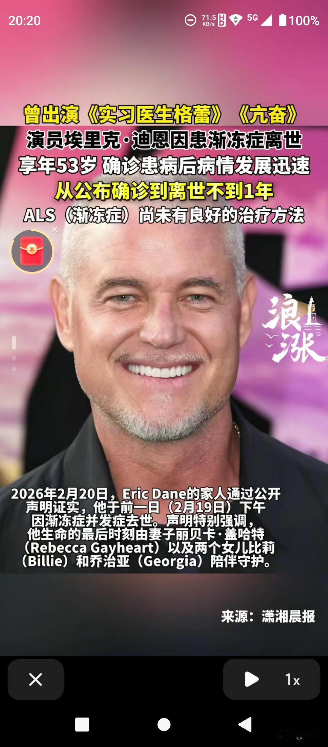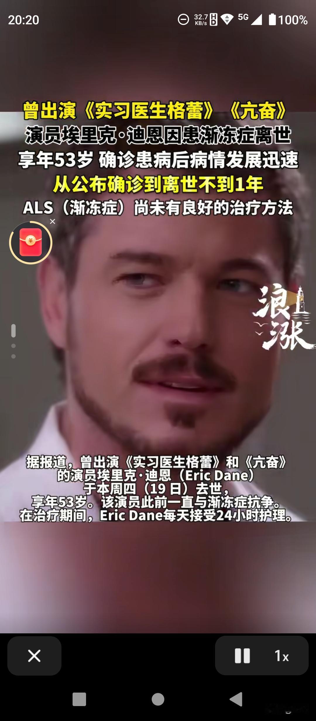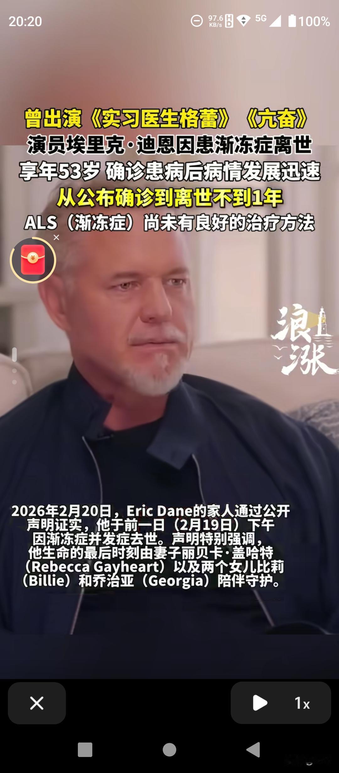 太突然!大年初四,好莱坞男星埃里克·迪恩因渐冻症离世,年仅53岁!从《实习医生格蕾》的“惹火先生”到《亢奋》中的硬汉父亲,他的演技深入人心。去年4月确诊后,他仍坚持拍戏,甚至本色出演渐冻症患者,为公益发声。短短一年,病魔夺走了他的生命,却没带走他的勇气。一路走好,真正的战士!
