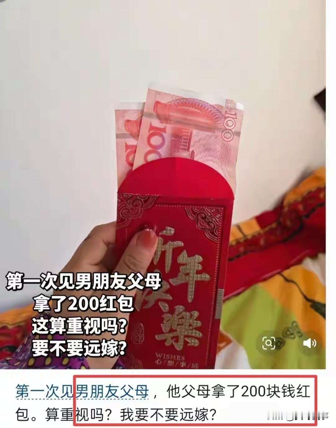 贵州,女孩自述第一次去男友家过年,男友的父母给她包了一个红包作为见面礼,可当她打开一看,心瞬间凉了半截:偌大的红包内,竟只包着薄薄的两张红钱。女孩见状,立马想要收拾行李离开。 据了解,这位女孩和男友交往已久,感情稳定,女孩这才决定跟着男友回老家过年的。 在她心里,这次见面意义非凡,意味着两人的关系即将尘埃落定,马上就要定下未来。 为此,她也充满期待,提前精心准备了一堆礼盒,带着十足的诚意去见未来的公公婆婆。 饭桌上的气氛还算和气,吃完饭后,准婆婆按照习俗,递过来一个红包。 女孩当时心里还挺开心,连忙礼貌接过。 可当接过红包那一刻,她心里就“咯噔”一下——红包太薄了,几乎摸不出厚度。 虽然心里觉得情况不对,但她也没有当场拆开,只是先收了起来。 等到晚上回到房间,女孩才悄悄打开红包,想看看里面的数额。 可这一看,她整个人都愣住了:红包里干干净净,只有两张百元纸币,不多不少,正好200元。 她甚至反复确认了好几遍,怀疑自己是不是没拿干净,可空空的红包袋里,除了这两百元,就再也没有别的东西了。 瞬间,失望像冷水一样从头浇到脚。 姑娘事后在镜头中无奈发问:“第一次见面礼,就只给了我200元,大家说,这个正常吗?” 她一再强调,自己并不是在乎钱,更不是贪图什么。她也没指望能拿到上千元的红包,只是觉得,过年加上第一次见家长,哪怕是666、888这样图吉利的数字,都能让人心里舒服,可200元,实在太让人寒心了。 女孩还认为,红包的数字从来不止是钱,而是态度,是男方家庭是否在乎这个未来儿媳的直接体现。 总之,200元的见面礼,让女孩越想越难受,甚至当天就萌生了回家的念头。 第二天一早,姑娘没有丝毫留恋,直接收拾好自己的包袱,头也不回地离开了男友家。 回到家后,她没有犹豫,直接发信息跟男友提出了分手。 一段原本奔着结婚去的感情,就因为一个200元的红包,彻底画上了句号。 这件事在网上也引起了热议,网友们的看法更是分成了几派。 有人完全理解女孩的做法,认为女孩第一次上门,又是过年,200元确实太过敷衍,这根本不是钱的问题,而是态度到不到位; 也有人觉得,可能是当地习俗不同,家庭条件也各不一样,女孩就不该用金额去衡量心意。 还有过来人坦言,第一次见面的态度,往往就是女孩和婆家婚后相处的缩影,不被重视的开始,注定走不长远。 说到底,女生在意的从来不是那几百块钱,而是自己带着诚意奔赴,却没有得到对等的尊重。 其实站在理性的角度看,这件事本不必走到分手这一步。 女孩的失望可以理解,毕竟第一次上门、又逢过年,谁都希望被重视、被认真对待,这份心情并不过分。 而男方家庭,或许也没有恶意,可能只是当地风俗如此,或是长辈习惯节俭,并不懂得年轻人心里的仪式感,未必就是故意怠慢。 要知道,心意这件事,本就没有统一的答案,有人看重数字,有人看重实在,有人觉得礼轻情意重,有人觉得仪式感不能少。没有绝对的对错,只有观念不同。 再者来说,两人能走到这一步也不容易,女孩可以在事后完全可以说出自己的感受,男方也应多理解女友的期待,双方坐下来把话说开,很多误会其实都能化解。 婚姻呢,本就是两个家庭的磨合,比起一个红包的金额,能不能互相理解、互相体谅,对遇件事情的态度如何,才是更重要的事。 对此,你说呢?欢迎大家在评论区留言。