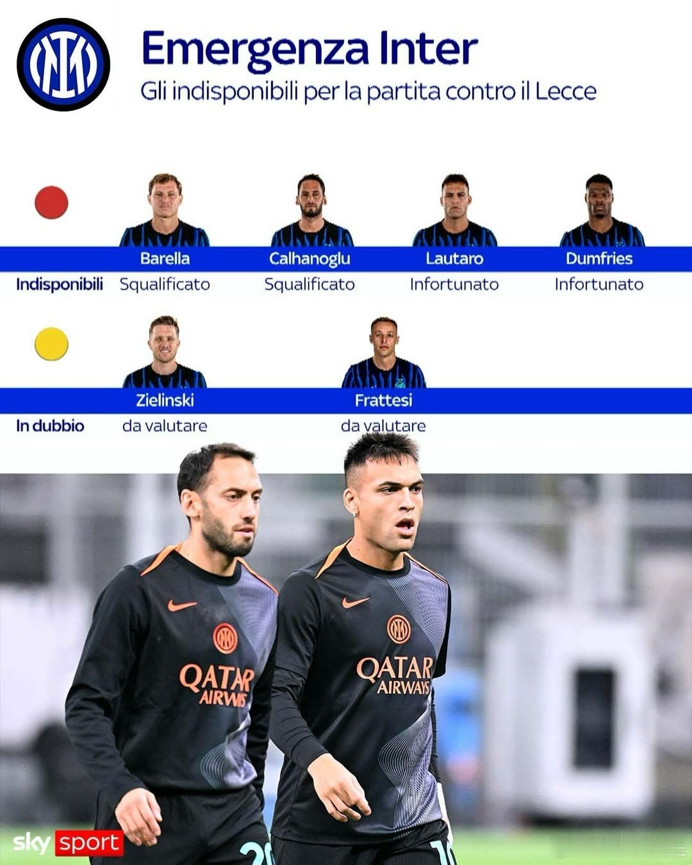 天空体育:领头羊国际米兰将对阵莱切,球队因停赛和伤病面临用人难题,齐沃将无法征召巴雷拉、恰尔汉奥卢、劳塔罗和邓弗里斯。另一方面,泽林斯基和弗拉泰西的身体状况仍有待评估。国际米兰劳塔罗意甲