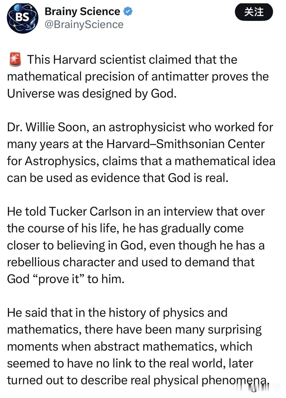 魏宏受(Willie Soon)博士是一位美籍马来西亚裔天体物理学家和航空航天工程师,曾长期任职于哈佛-史密松天体物理中心。 魏宏受博士因其在太阳物理学及其与地球气候关系领域的研究而闻名。 魏博士在接受 Tucker Carlson 采访时提出,数学公式可以证明上帝的存在。他认为宇宙并非诞生于偶然,而是根据一种深层的意图而有序运行的。 精细调节理论: 他的核心论据是“精细调节参数”(fine-tuning argument),即宇宙的物理定律和常数被极其精确地设定,使得生命得以存在,这种精确度暗示了背后有一位“伟大的数学家”或“创造者”。 魏博士引用了英国物理学家保罗·狄拉克(Paul Dirac)在 1963 年提出的理论,探讨了数学如何与现实世界的理解相联系,特别是时空曲率等几何概念。