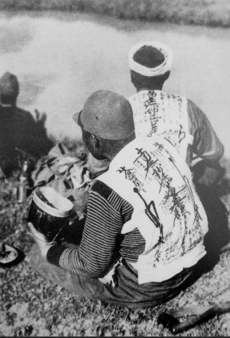 图1:抗战时期,身着《妙法莲华经》背心,在河边吃饭的侵华日军士兵图2:五台山僧人自发成立的抗日和尚连
