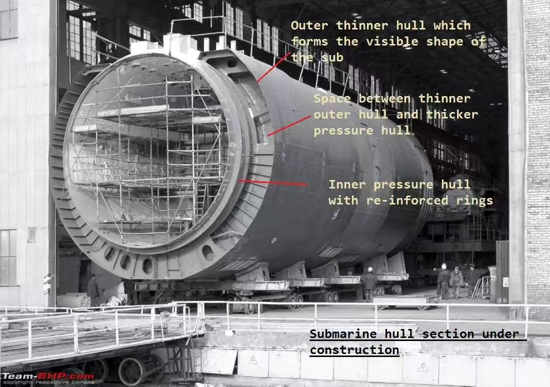 烽火问鼎计划每天认识一件兵器 潜艇壳体设计对潜艇长径比的影响:由于美国潜艇采用纯粹的单壳体设计(图1),使得压载水舱不得不布置在艇艏和艇艉(图2),进一步增加了艇体长度;而苏联双壳体潜艇的压载水舱布置在两个壳体之间(图3),利于降低潜艇的长径比(图4)。
