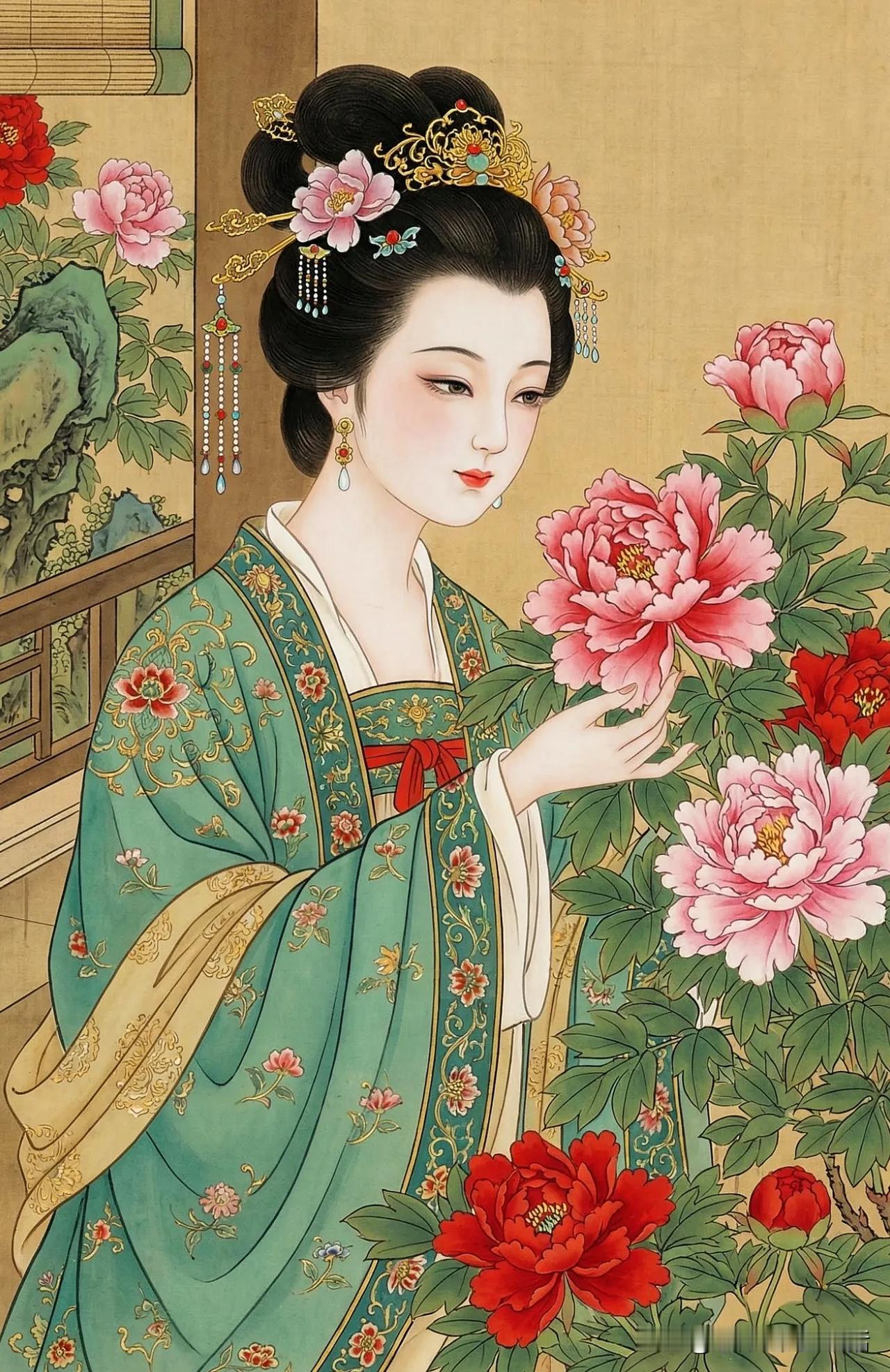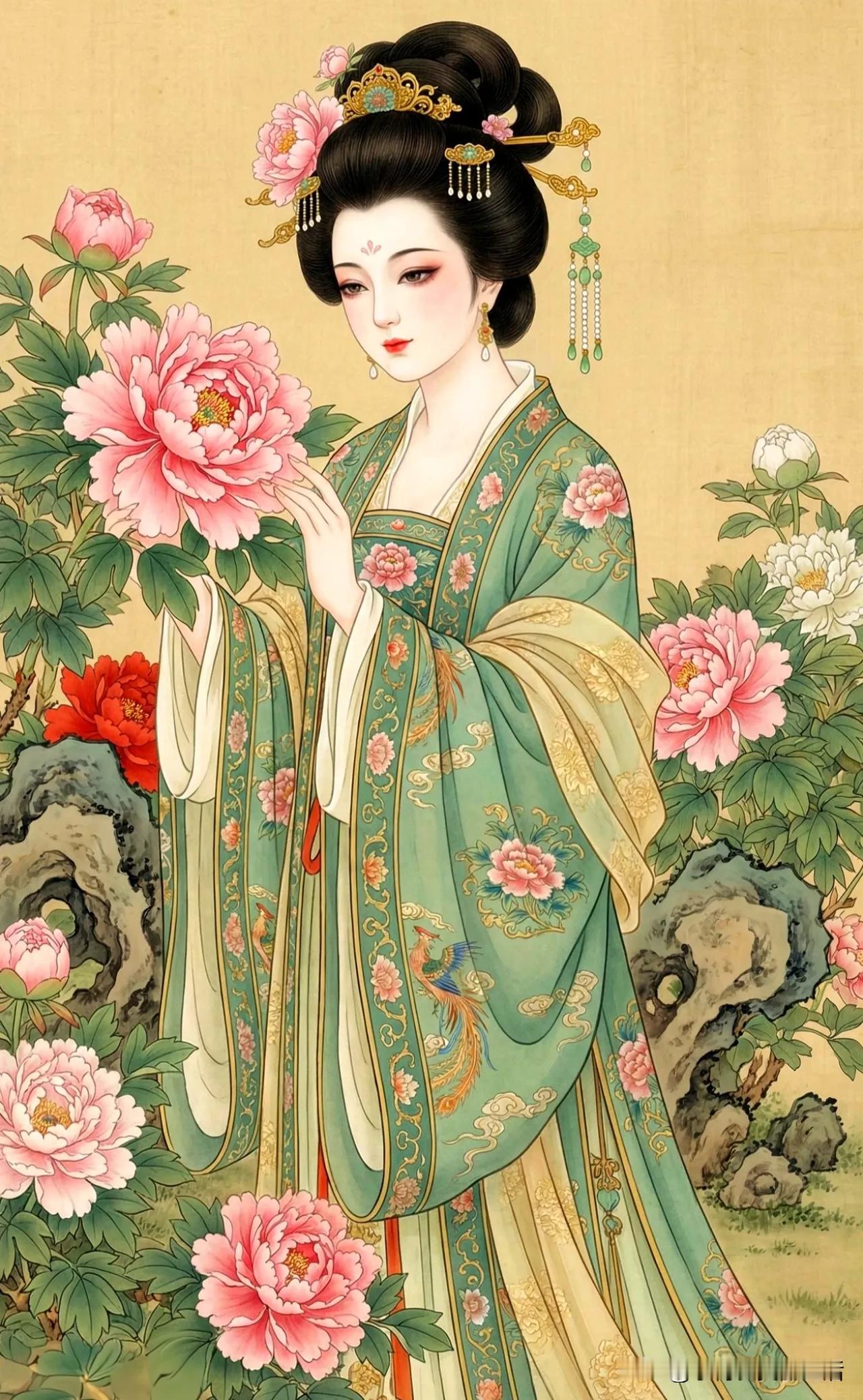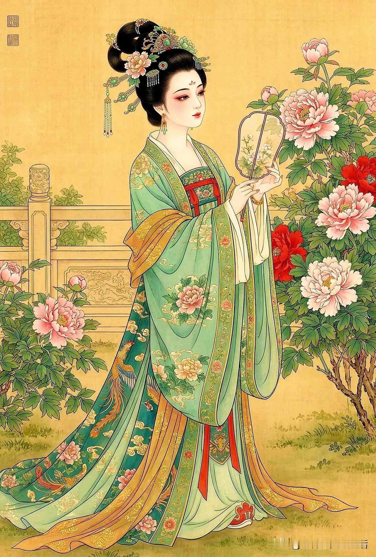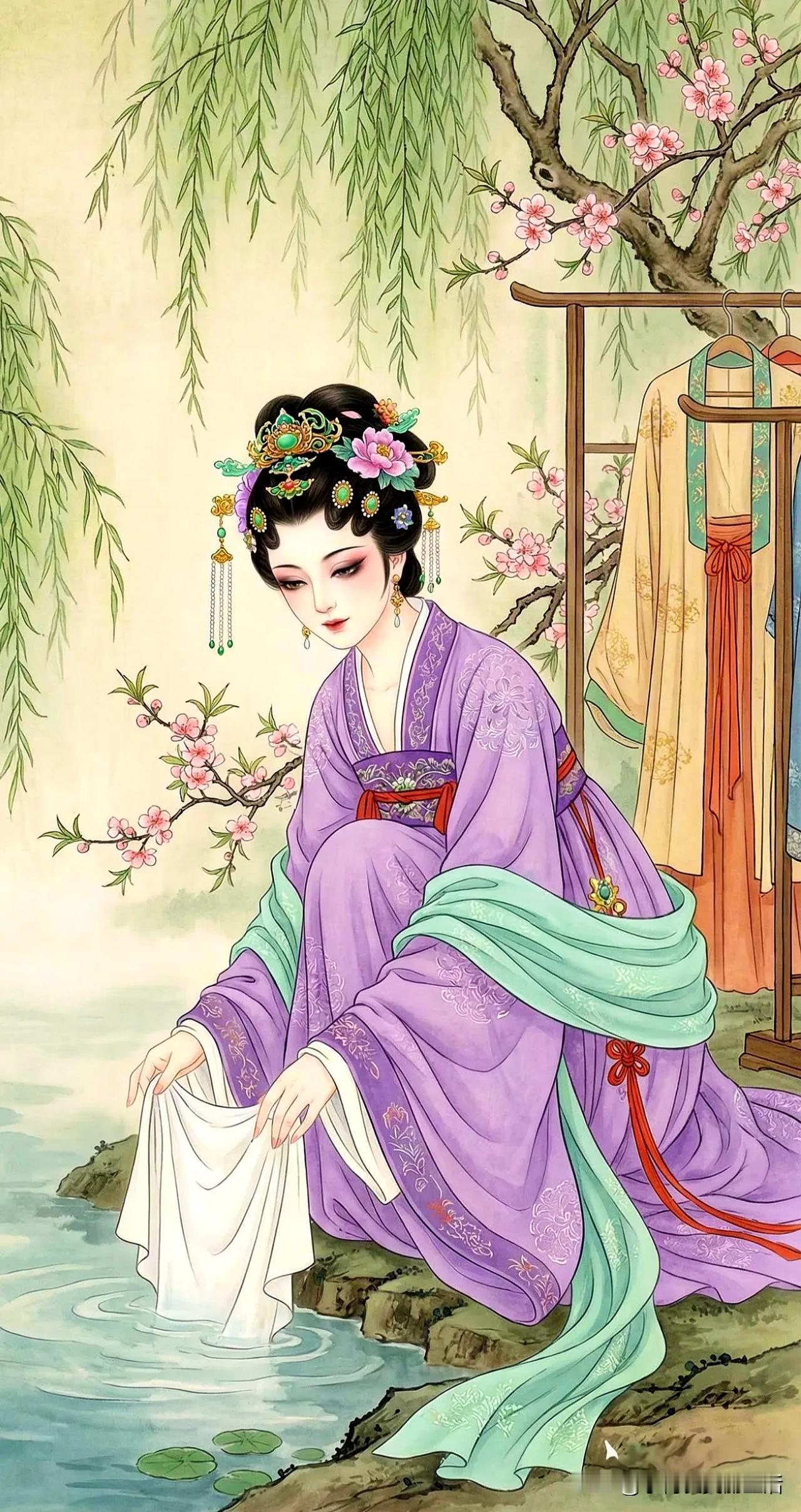 穿越千年的古典美人,手持团扇,静看桃花盛开。