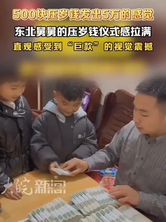 500元压数钱,发出5万的气场:这届年轻人,把年俗玩明白了 春节红包内卷愈演愈烈,有人打肿脸充胖子,有人嫌少伤和气。直到500元压数钱,发出5万感觉刷屏全网,我们才恍然大悟:过年的体面,从来不在金额而在心意与仪式感。 东北舅舅把500元换成崭新零钱,捆成厚厚一沓,再配个铁盆轻敲小辈脑袋,一句“敲一下长一岁”,全场笑翻。孩子抱着“巨款”又惊又喜,亲戚们拍手叫好成本不过几百,快乐值直接拉满。这哪里是发红包,分明是把祝福做成了全家的高光时刻。 有人说这是哗众取宠,我却觉得,这是最清醒的反内卷。比起转账时的冰冷数字,一沓沉甸甸的现金、一句暖心的吉利话、一段搞笑的互动,更能留住年味我们要的不是攀比,是被重视、被宠爱被认真对待的感觉。500元不多,但用心包装后,就是独一份的偏爱。 压数钱的本意是压祟祈福、护佑平安,如今被年轻人重新解读:不拼财力,拼创意;不比厚度,比温度。折成爱心、捆成金条、配上专属祝福,哪怕金额不大,也能让收到的人记一整年。 这波走红,戳中了所有人的心声:人情不该被金钱绑架,年味不该被攀比冲淡我们努力生活,不是为了打肿脸充胖子而是用最小的成本,给家人最多的快乐。 今年你家压数钱怎么发?是跟风玩仪式感,还是坚守传统?评论区聊聊,看看谁才是真正的年味高手!