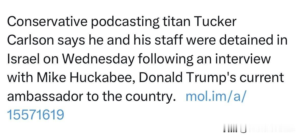 美国媒体报道:保守立场的播客大佬塔克·卡尔森(Tucker Carlson)向媒体透露表示:就在本周三,他和他的员工在与唐纳德·特朗普现任驻以色列大使迈克·哈克比(Mike Huckabee)完成电视采访后,在以色列被警方拘留。 拘留原因目前尚未有官方披露。