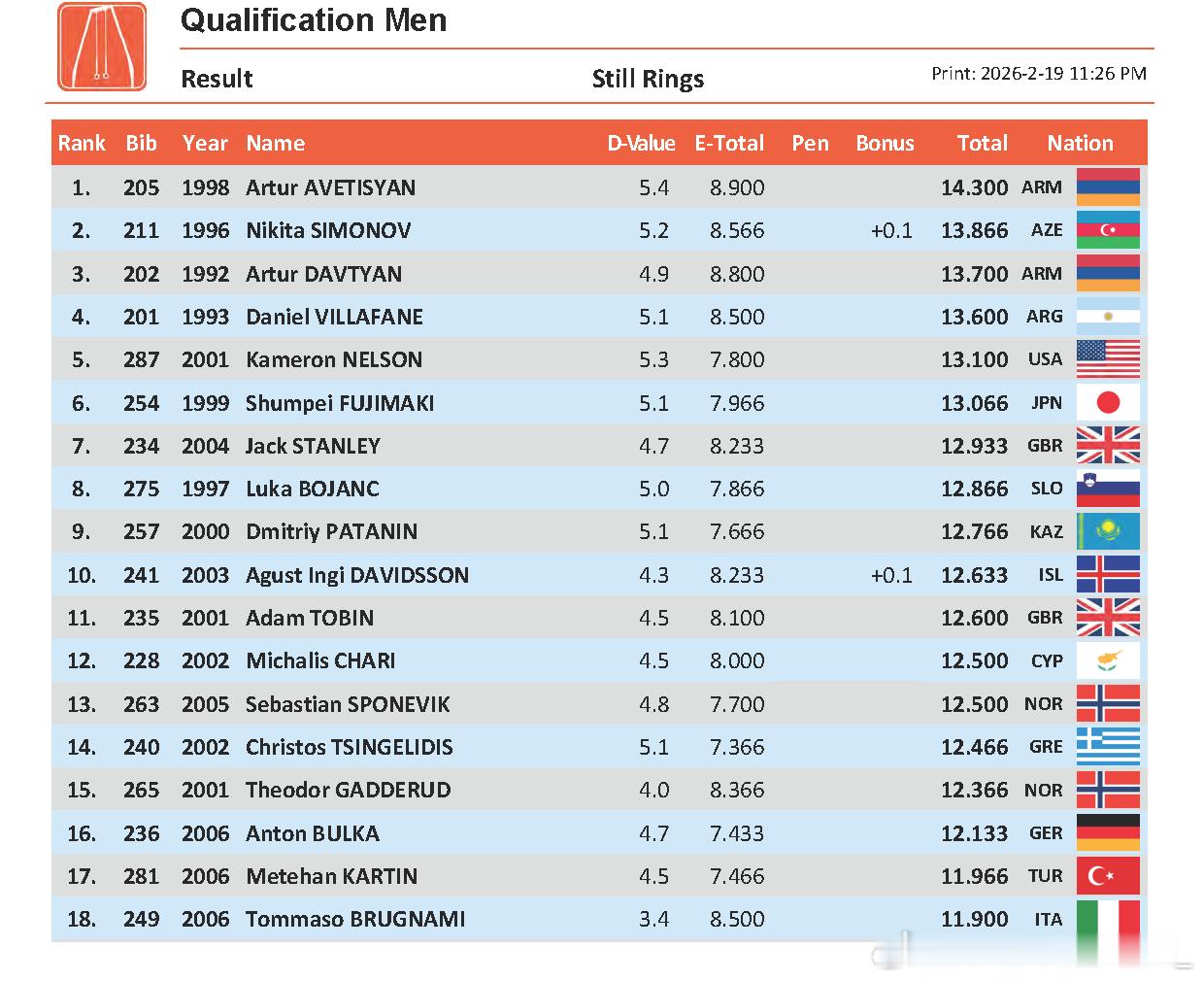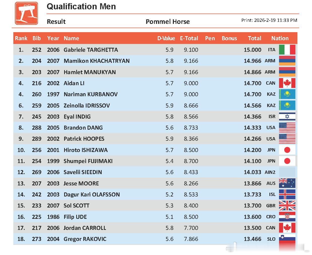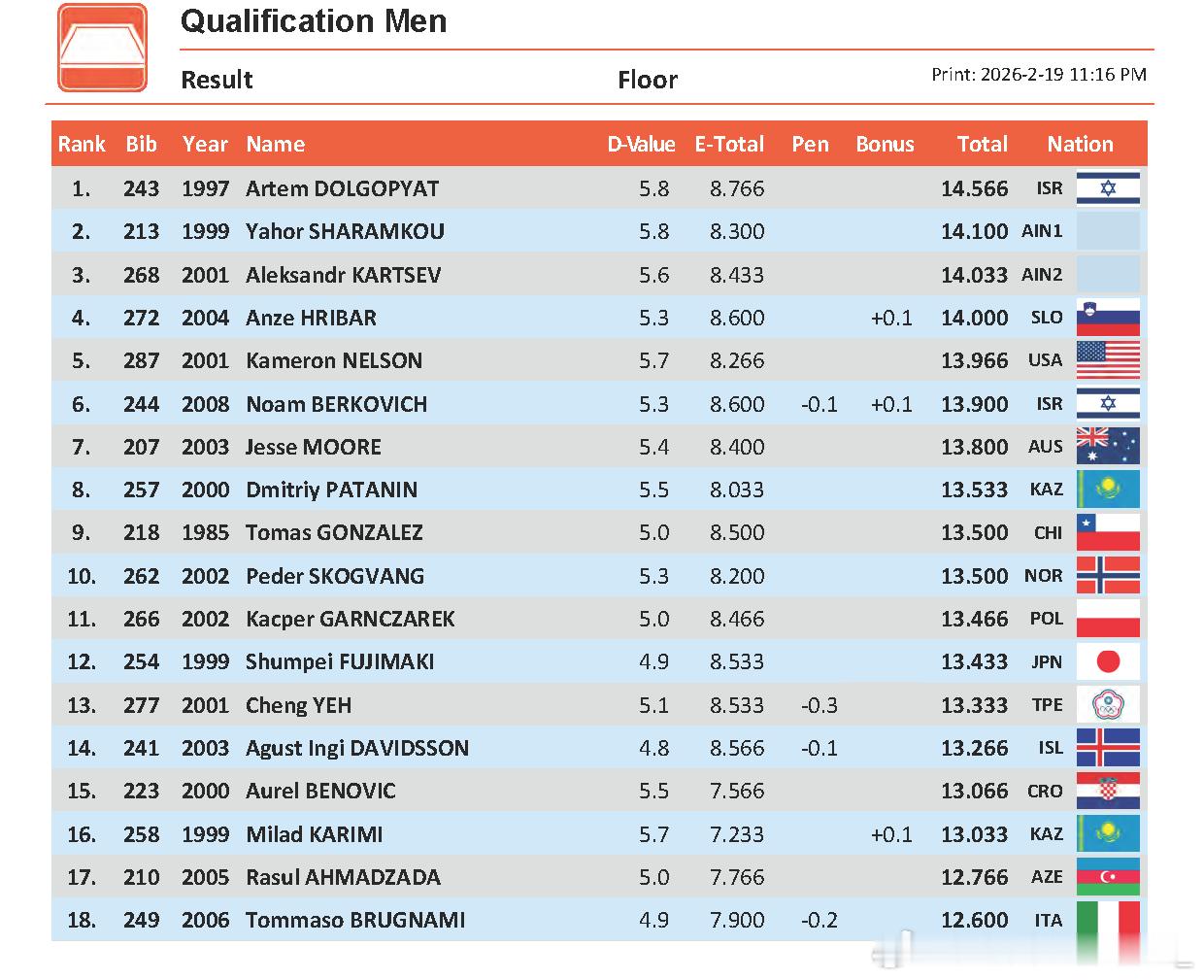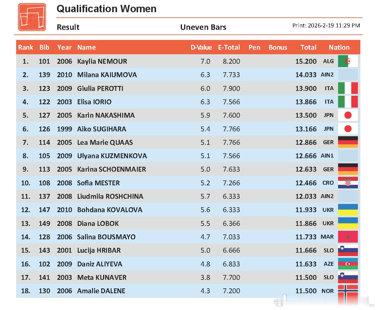 科特布斯站 资格赛第一天 德国选手Karina Schoenmaier暂列预赛女子跳马首位(5.0+9.066/4.2+8.8 +0.2)。阿尔及利亚名将Kaylia Nemour的新编排获得7.0+8.2的高分,轻松以预赛第一晋级高低杠决赛;去年世青赛夺冠的俄罗斯10年小将Milana Kaiumova暂列第二(6.3+7.733)。男子项目仍然以鞍马最卷,意大利06年小将Gabriele Targhetta暂列预赛首位(5.9+9.1),亚美尼亚两位07年小将Mamikon Khachatryan和Hamlet Manukyan以5.8+9.166和5.7+9.166暂列二三名。以色列选手Artem Dolgopyat和亚美尼亚选手Artur Avetisyan分别暂列自由操和吊环首位(5.8+8.766,5.4+8.9)。