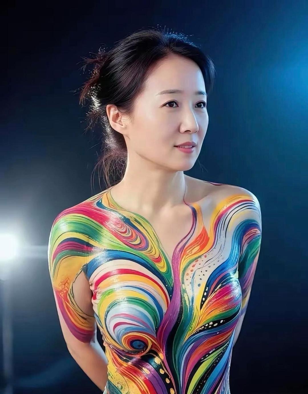 这色彩就跟流动的彩虹缠身上似的,身上每处曲线都像在讲“这是鲜活艺术”。有人觉着“太招摇”,可美哪有啥固定标准?穿洛丽塔是美,穿工装也是美,把颜料弄成“衣服”样,就像把身体当画布,浪漫得很呢~