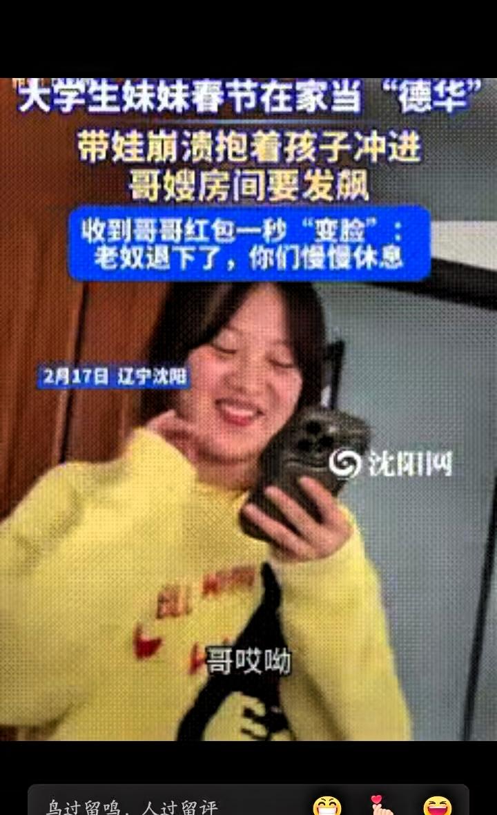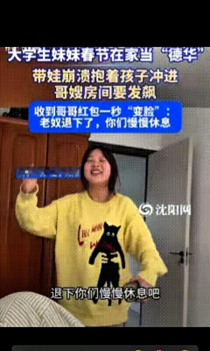 “不当影后真可惜!”2月17日,辽宁沈阳,大学生妹妹放假回家,她原本放假回家,想好好休息几天,结果春节期间,哥哥嫂子让她帮忙照看孩子。 一开始还能应付,可时间一长,每天早起带娃,精力实在跟不上。大年初一一大早六点多,她就起来照顾孩子,忙得疲惫不堪,看到哥哥在房间里休息放松,心里一下子就委屈了。 她忍不住走进房间,把心里的不满说了出来,语气带着累到极点的烦躁,直言自己实在扛不住,不想再带了。场面一度有点小紧张,不少人都觉得兄妹俩可能要闹点小矛盾。 可哥哥并没有生气,只是让她看一眼手机。妹妹打开手机,看到哥哥发来的红包,态度立刻温和下来,刚才的委屈和火气一下子消散,笑着跟哥哥撒娇,语气也变得亲昵又懂事,还很乖巧地退出房间,让哥哥好好休息。 这一幕虽然反差明显,但一点也不夸张,更像是很多家庭里都会发生的小事。很多人看了都觉得真实又暖心,这不是势力,也不是演戏,而是亲人之间最自然的相处模式:有情绪会直接表达,一点心意就能化解小别扭,不用客套,也不用伪装。 平淡又真实的日常,吵吵闹闹又马上和好,正是这种不刻意、不做作的相处,才让春节更有烟火气,更有家的味道。亲人之间,从来都是直来直去,又彼此包容。