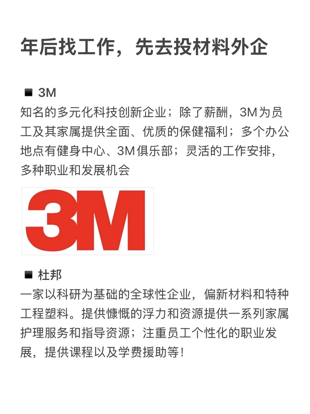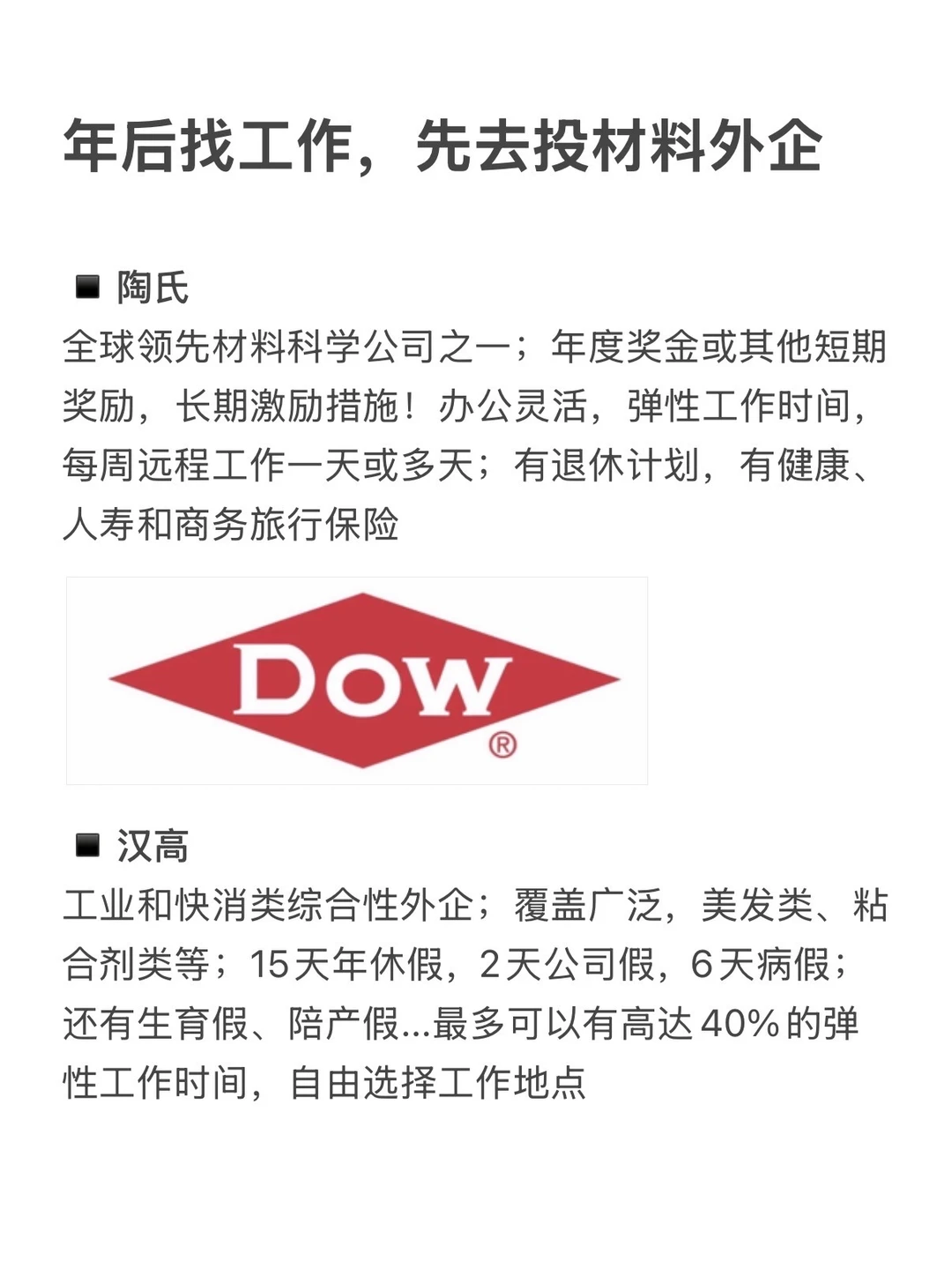 年后找工作,材料外企真的可以优先看看。新能源、半导体、汽车轻量化都离不开材料,行业不高调,但是非常核心,除了技术岗,行政、财务、供应链等职能类需求也很大! · 为什么建议投材料外企? ▪️晋升路径清晰,国际视野 ▪️工作氛围好,注重wlb,很多都支持居家办公 ▪️五险一金+补充医疗,年假基本上是10天起步、圣诞假、生日假... · 坚持日更✊🏻,帮大家在找工作路上顺利拿 offer! ·