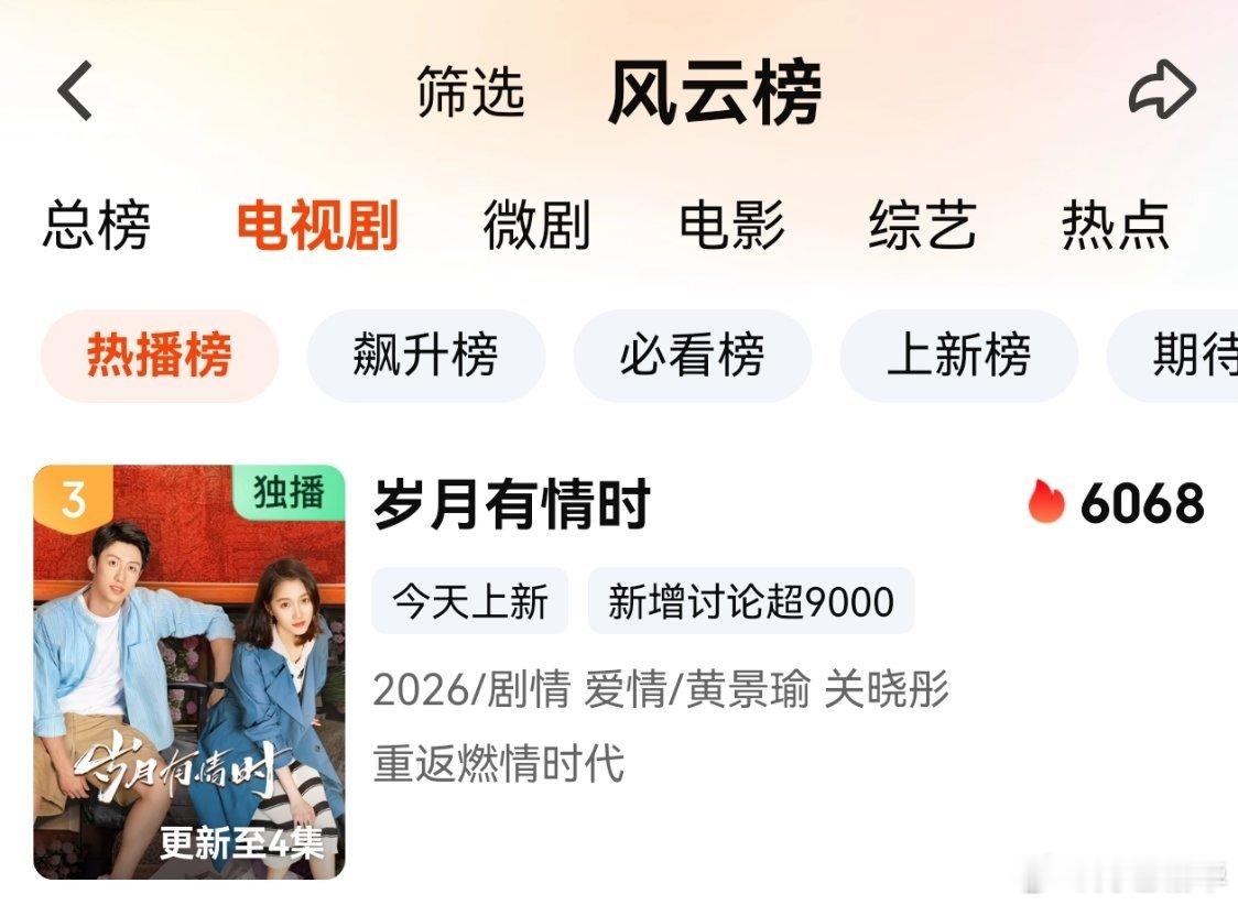 电视剧岁月有情时黄景瑜张小满 破6000!更新4集首日热度应该比《罚罪》2好,但