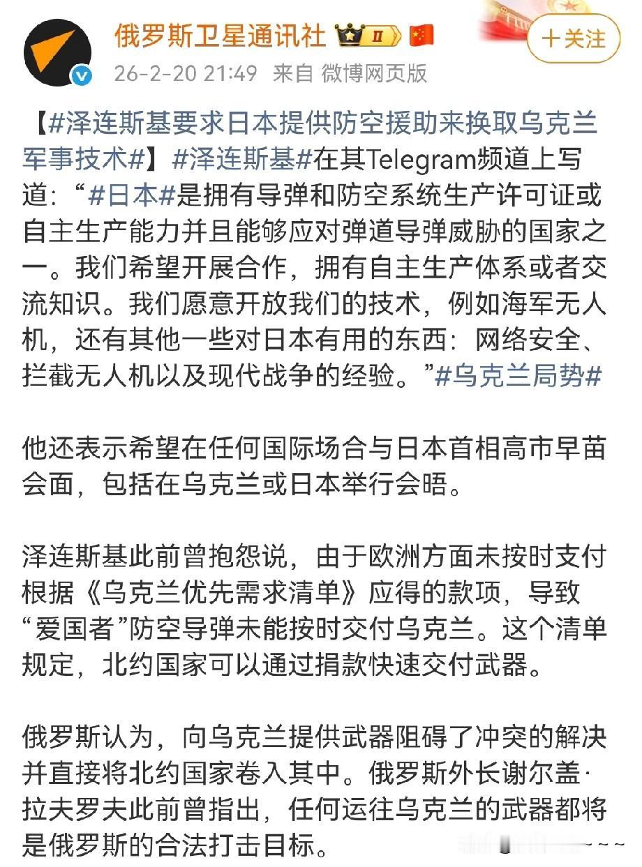 快讯!快讯! 就在刚刚,乌克兰要求日本提供防空援助,以换取乌克兰的军事技术。 我看这是乌克兰没有办法了,因为美国也不想帮忙了,欧洲也帮不上忙了。所以,就是低三下四的向日本来要点东西啊,毕竟乌克兰现在最缺的就是防控导弹系统。当然了,乌方不是要拿东西来交换。乌克兰可能认为打了四年仗,武器装备都是经过实战检验过了!不知道日本和乌克兰会不会一拍即合,反正都想的挺美。。[捂脸]