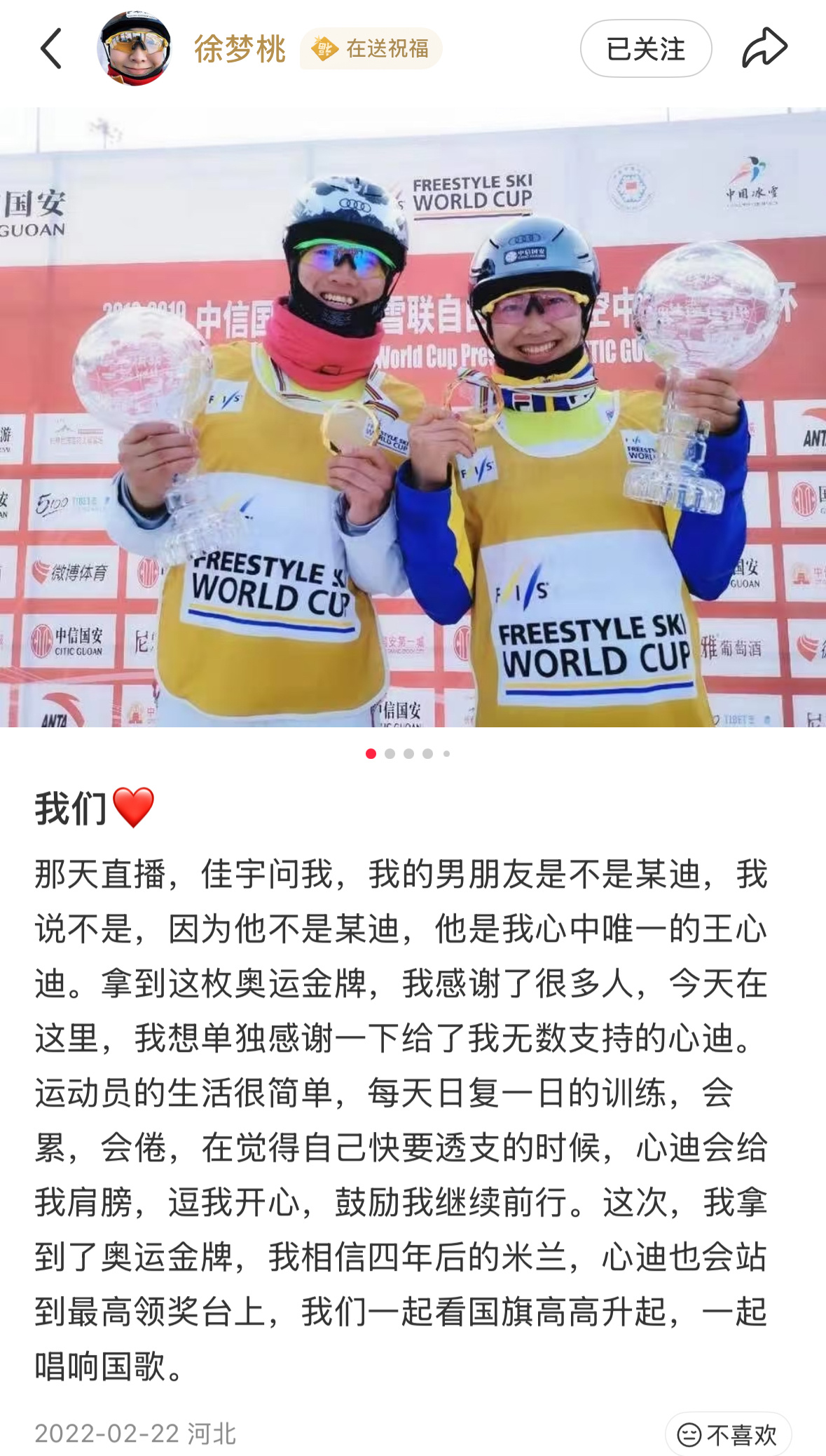 四年前拿到奥运金牌后,曾发文说:“这次,我拿到了奥运金牌,我相信四年后的米兰,心迪也会站在最高领奖台上。”四年后的今天,徐梦桃对的祝福,真的实现了!桃心组合实力与爱并存!