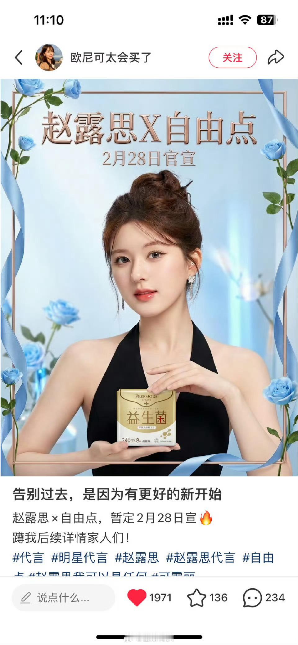 我嘞豆 自由点跟虞书欣合约到期 换了新的代言人赵露思