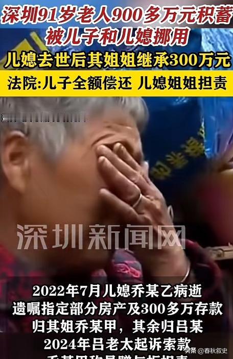 “不要低估人性!”广东深圳,9旬老人想着自己年事已高,行动不便,膝下也只有一个儿子,便把900余万元存款全部转给儿子,怎料,儿子事后又把钱转给儿媳,儿媳拿这些钱支付日常开销、偿还房贷、装修房子也就罢了,在去世前还留下遗嘱指定自己的姐姐继承其中的300万元以及房子50%的产权。老人知道后,愤怒不已,以借款为由,一纸诉状将儿子以及儿媳的姐姐告上法庭,要求儿子以及儿媳的姐姐退钱,老人儿媳的姐姐则认为老人转给儿子儿媳的钱不是借款,也不是保管,而是赠与,老人无权索回。法院这样判! - 91岁的吕老太怎么也想不到,2024年那个说要拿钱看病的下午会变成她最漫长的一天,儿子吕某站在她面前吞吞吐吐绕了半天,最后才把话挑明那900多万早没了,她听完像被人当头敲了一闷棍, 那900多万真不是零花钱,里面有卖掉北京老房子换来的全部钱,也有她几十年抠着牙缝攒下的积蓄,这是寡母把儿子养大后留给自己养老看病的底牌,她一直当它是救命绳,没想到被人悄悄剪断了, 从2018到2021这三年里,她一笔笔把钱转到儿子账户,每次都交代你先替我存着以后看病养老就靠它,儿子拍胸口保证妈放心,她也就真信了,毕竟亲儿子谁会想到他能坑到这份上, 可钱一到儿子手里就被他转给媳妇乔某,日常花销还房贷搞装修全往小家里流像流水,吕老太问起他就敷衍一句还存着别操心,她信了不再追,等真要用钱才发现自己连个字据凭证都没留, 2022年7月儿媳乔某一去世,家里还没从悲痛里缓过来,就又翻出一份遗嘱,上面写得明明白白,300万现金加那套房子一半产权,都指定留给她亲姐姐乔某甲,吕老太一听就气得发抖,她想不通自己托付出去的养老钱怎么就被儿媳写进遗嘱送给外人,这口气她咽不下去, 她最后只能走法律这条路,把诉状递到深圳市福田区人民法院,被告席上坐着两个人一个是她的独子吕某,另一个是她几乎不认识的亲家乔某甲,开庭那天她要面对的不只是钱的去向,还有亲情被撕开的难堪, 乔某甲的说法听起来很硬,她说老太太把钱转给儿子就是赠与,我妹妹拿到钱就有权处分属于她那份,遗嘱继承合法合规凭什么要我还,这套逻辑如果只看转账记录好像还能绕人,但法官没被带偏,判决一步步把关系拆清楚, 法官先把两条路都堵死,这钱不算借的因为没借条也拿不出双方约定借贷的证据,也不算送的因为母子都不承认是赠与,再说900多万是老人一辈子积蓄,硬说成白送明显不公平,第三结合吕老太高龄行动不便母子关系以及转账时口头约定,认定双方成立保管合同关系也就是儿子代管钱仍归母亲, 更关键的是钱花到哪儿去了,法院引用民法典第1064条认定这笔钱被用于夫妻共同生活,还房贷搞装修过日子每一分都花在两口子身上,那就属于夫妻共同债务不是谁一句我不知道就能撇清,乔某甲想靠遗嘱继承躲开也不行,民法典第1161条写得明白继承人在所得遗产范围内必须清偿被继承人的债务, 法院判得很直接,儿子吕某得把母亲900多万还回去,乔某甲在她继承到的遗产范围里也得一起承担清偿责任,判决已生效吕某正分步退钱乔某甲也在配合拿遗产去抵,法律上结了但亲情那道伤口很难缝好, 这案子最让人唏嘘的不是法条多硬,而是很多老人都信那句早晚都是你的我先给你,他们把血缘当契约把亲情当保险柜,不立字据不留凭证不设防线一股脑把身家交出去,等真要用钱才发现自己什么也抓不住, 法院这次判得明白可吕老太已经91岁,她还要等多久才能把钱真正拿回手里,这也是最残酷的地方,所以这案子想提醒的其实就一句,爱可以无条件但钱不行。
