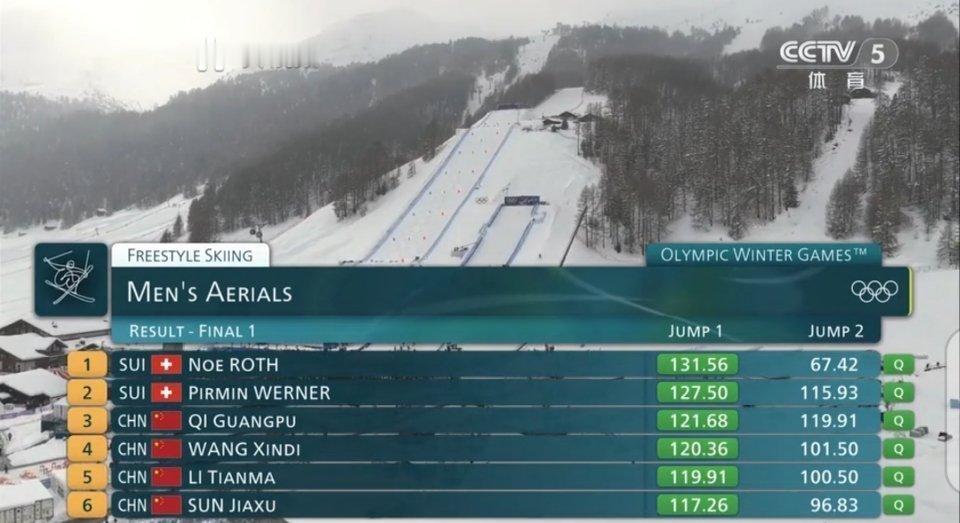 自由式滑雪男子空中技巧决赛决赛第二轮结束,中国男队四位选手全部晋级决赛最后轮,一
