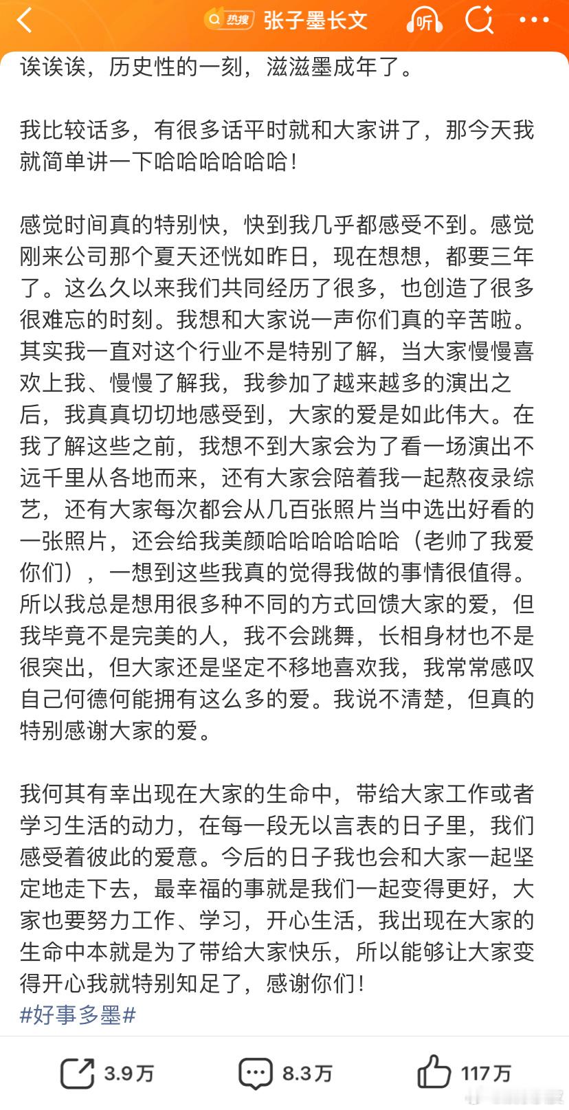 张子墨长文张子墨生日长文🈶️ 感慨加入公司近三年的时光飞逝。他特别提及粉丝跨城追演出、熬夜陪录综艺、百里挑一修图等细节,坦言这些付出让他深刻感受到“爱的伟大”,并多次强调“何德何能拥有这么多爱”。祝张子墨生日快乐春节刷到宝了马年大吉