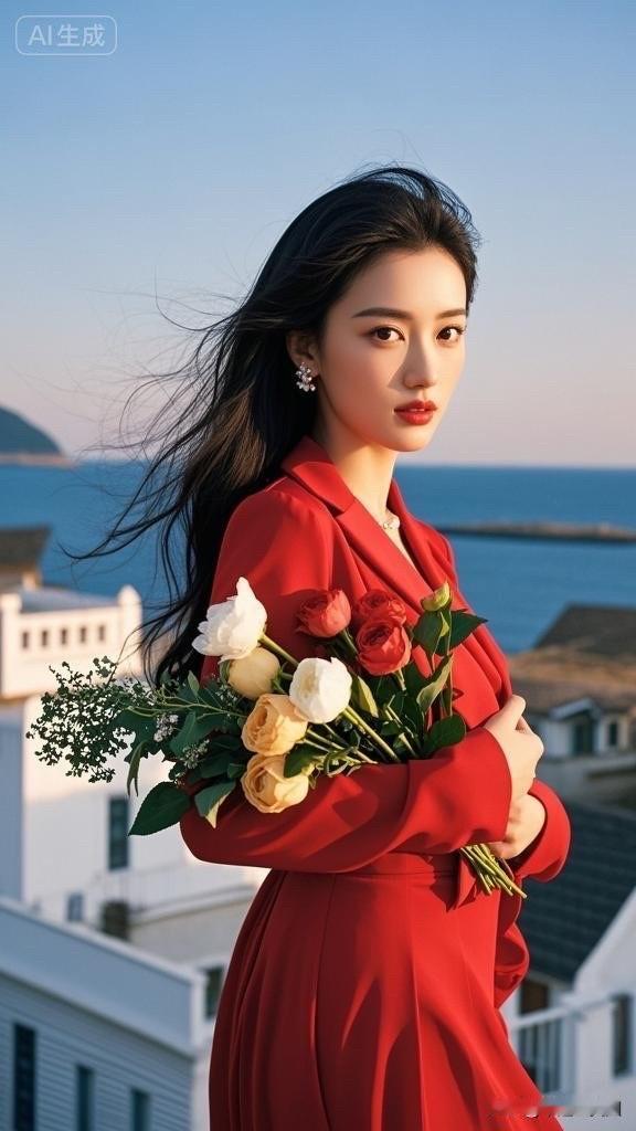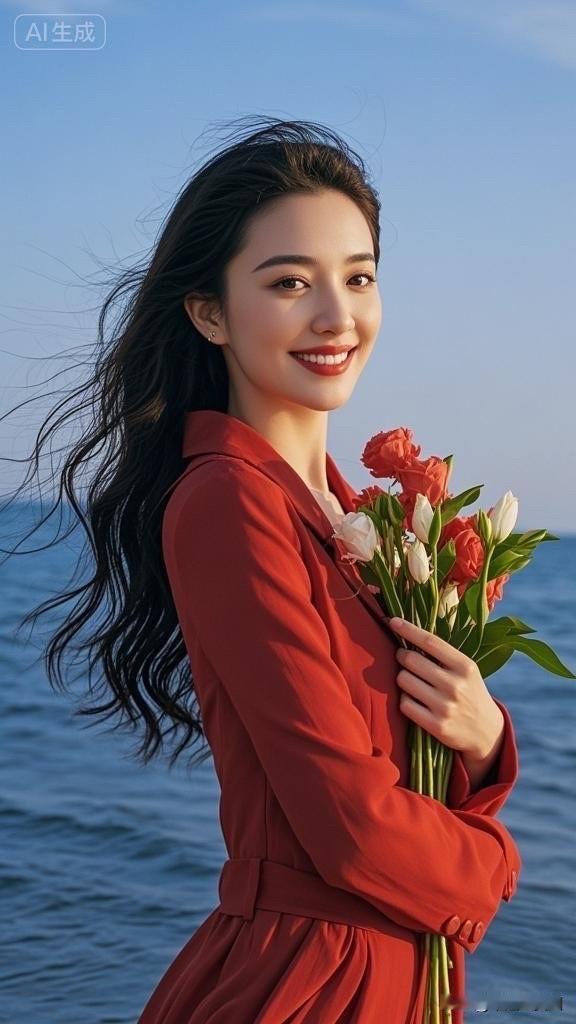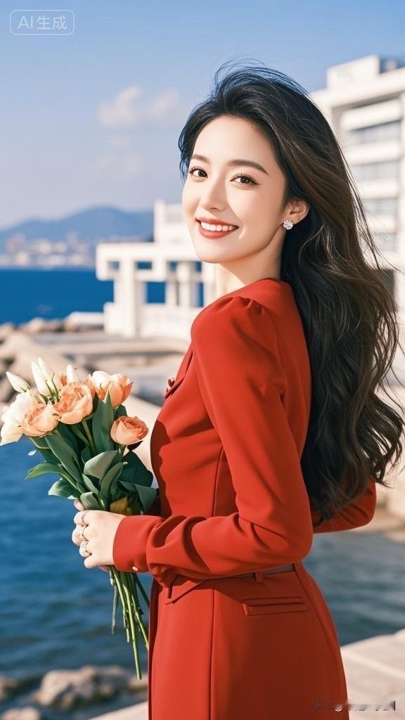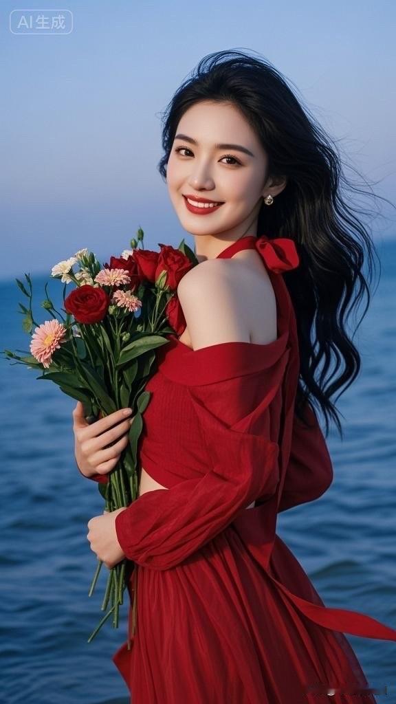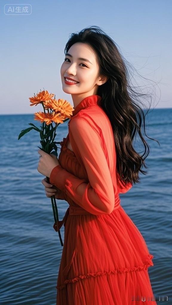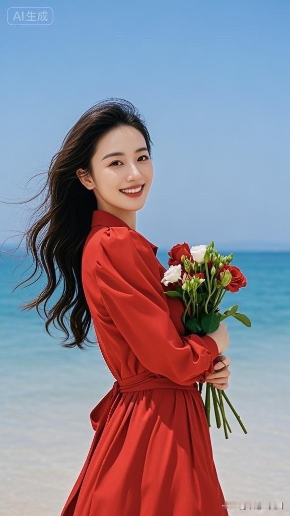 海边漫步,红裙飘逸,花束相伴,笑靥如花