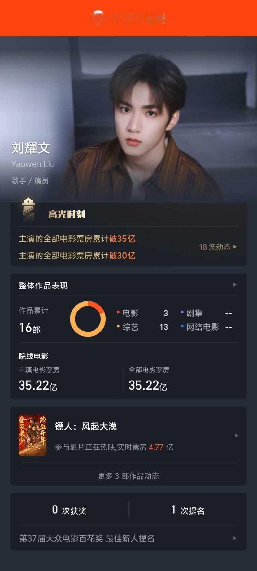 刘耀文主演电影累计票房已破35亿!今年春节档的《惊蛰无声》《镖人》口碑都不错!!!好厉害吧小文文