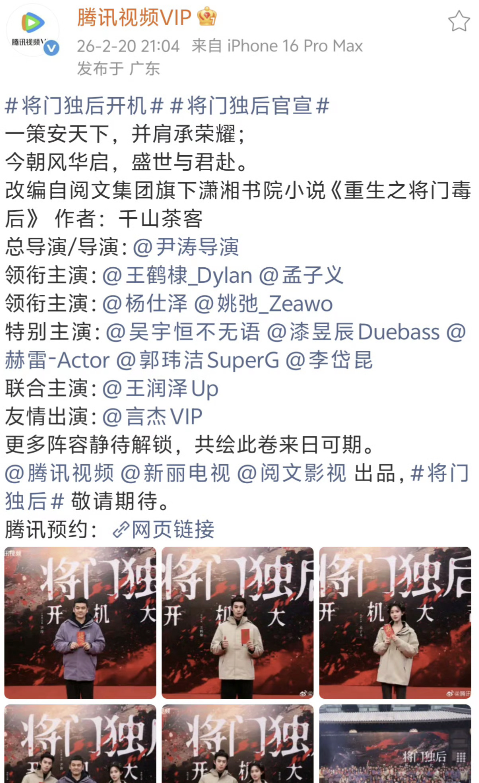 腾讯视频vip官博发的将门独后配角阵容,目前官媒和腾讯视频都还没发