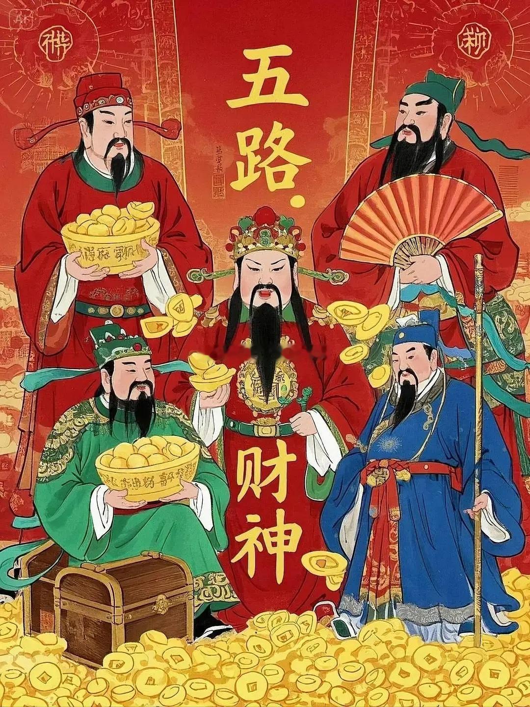 大年初五迎财神 天门开、地门开,五路财神进门来,一赐福、二赐财,赐来金银抱满怀,恭迎五路财神进我家门来!