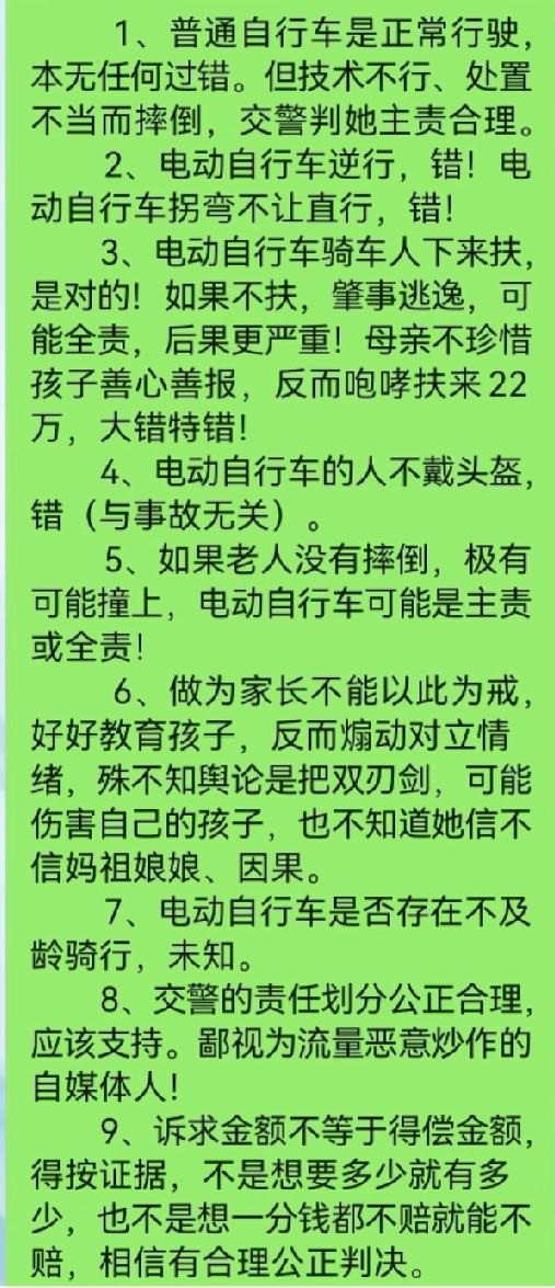 近日,“福建莆田女子骑自行车摔倒索赔22万”这个事情冲上热搜。网友基本是一边倒的站在了骑电动车的两个初中女生这边,认为摔倒女子及家属的索赔是不合理的,认为交警判定两个初中女生次责的责任认定是不合理的。 不过,还是有部分网友提出了不同的观点,他们认为:至少交警的责任认定是没有大的问题的。他们的理由是:两个初中女生骑电动车拐弯时是处于逆行状态的,占用了其他车道,突然驶出,是造成骑自行车女子摔倒的诱因。 评论区的网友们,你们认可这位网友的观点吗?