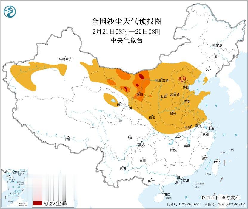受冷空气大风影响,预计2月21日08时至22日08时,新疆东部和南部、内蒙古中西部、青海东北部、甘肃中西部、宁夏、陕西大部、山西、北京、天津、河北、河南、山东、湖北北部、安徽中北部、江苏中北部等地有扬沙或浮尘天气,其中,内蒙古西部、甘肃西部、宁夏中北部、陕西北部等地的部分地区有沙尘暴,局部有强沙尘暴(见图4),中央气象台2月21日06时继续发布沙尘暴黄色预警。