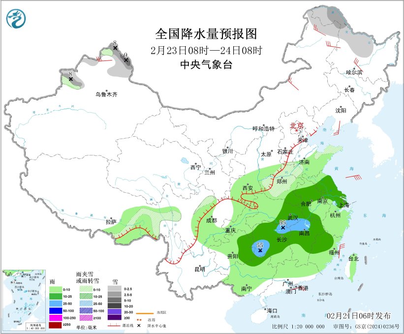 此外,22日至24日,黄淮南部、江淮、江汉、江南、华南及西南地区东部有小到中雨,其中江南和华南西北部的部分地区有大雨,局地暴雨,并伴有雷暴大风、冰雹和短时强降水等强对流天气;甘肃南部、陕西中南部、山西南部及黄淮北部等地有雨转雨夹雪或小到中雪。