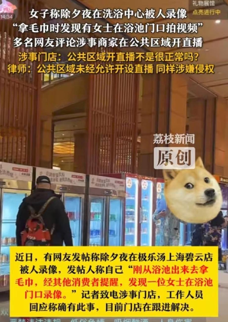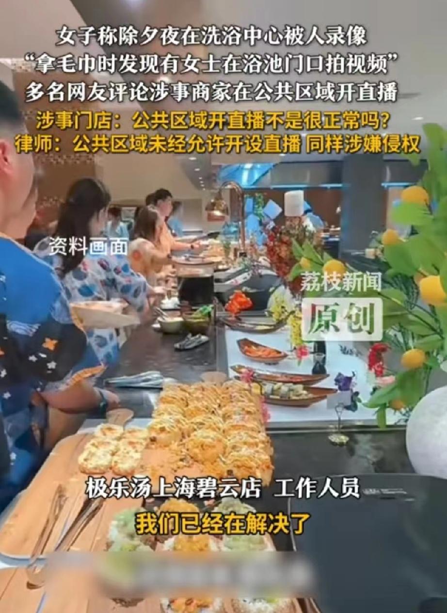 上海,女子在洗浴中心洗完澡,出来拿毛巾时,竟发现有人拿着手机在门口拍视频,甚至对着女浴室门开直播。这种行为让女子非常反感,将自己的遭遇发到了网上。对此,洗浴中心工作人员竟不以为然,完全没意识到侵犯了客人隐私,还反问:开直播不是很正常的事吗? 近日,有网友在网上发帖,讲了自己除夕夜在某洗浴中心的糟心事儿。 这位网友说,自己刚从浴池出来,准备去拿毛巾,多亏旁边其他消费者提醒,这才发现有个女士在浴池门口拿着手机录像。 这可把网友气坏了,自己好好洗个澡,咋就被人偷拍了呢,心里又气又觉得隐私被侵犯了。 记者看到帖子后,赶紧致电涉事门店。 门店工作人员回应说,确实有这么回事儿,当时当事人发现被录像后,现场就报警了。现在门店正全力协助警方处理,也在跟进解决这个问题。 记者接着翻看这个帖子的评论区,发现不少消费者都反映,该洗浴中心好几家门店都在公共区域搞直播。 大家纷纷质疑,这直播行为严重侵犯了顾客的隐私。 记者又向涉事门店核实直播的事儿,没想到,工作人员的反应让人意外,居然没觉得有何不妥,还反问记者:“那不是很正常吗?” 工作人员还跟记者说,报警之后,警察来了,主要协助处理前台区域的事儿,也了解了这个情况,后续肯定会跟进的。 其实,有一部分消费者对门店在公共区域直播这种方式特别不满,甚至非常抵触。 因为在直播间里,有些人的评论特别不友好,恶意攻击别人。 就比如说,看到有人胖点,就评论“这小子真胖,那么大肚子就别出来洗了”,这多伤人。 而且像女浴室门口这种地方,那可是高度隐私区域,在这儿直播,特别容易拍到进出的人。 就算大家穿着衣服,那也直接涉嫌侵犯隐私权了。 《民法典》第1032条规定:自然人享有隐私权,任何组织或者个人不得以刺探、侵扰、泄露、公开等方式侵害他人隐私权。 未经别人同意,不能制作和使用别人的肖像。 洗浴中心浴室门口、休息区等属于顾客隐私合理期待区域,未经许可拍摄、直播并公开他人影像,只要能拍到可识别的人脸,哪怕只是背景,都构成对隐私权与肖像权的侵害。 而且,偷拍、直播隐私行为同时违反《治安管理处罚法》第四十二条:偷窥、偷拍、窃听、散布他人隐私的,可处五日以下拘留或五百元以下罚款;情节较重的,处五日以上十日以下拘留,可并处五百元以下罚款。 门店未尽安全保障与隐私保护义务,需承担民事侵权责任,故意拍摄者还将面临行政处罚。 要是有人恶意满满,就算他没把拍的东西发到网上,就只是拍了,那按照规定,他也可能得被拘留或者罚款。