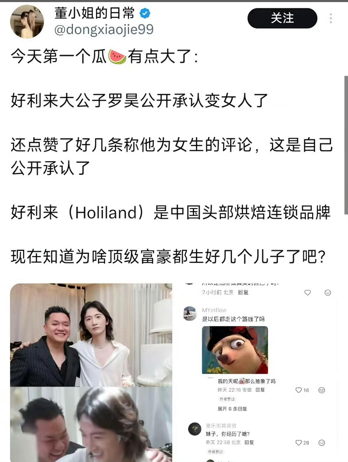 好利来大公子 恋综推手推这种热点又是在传播LGBT,这点小心思昭然若揭。另外,有名有姓不说是谁,非要说好利来大公子,以为是言情小说呢。