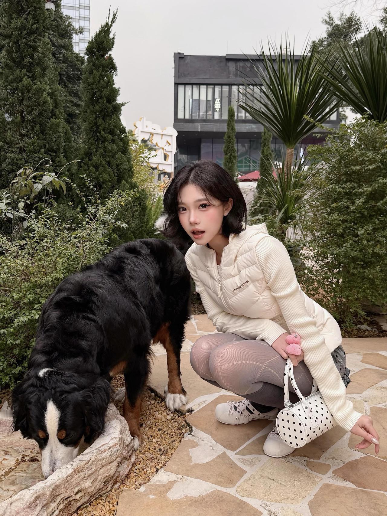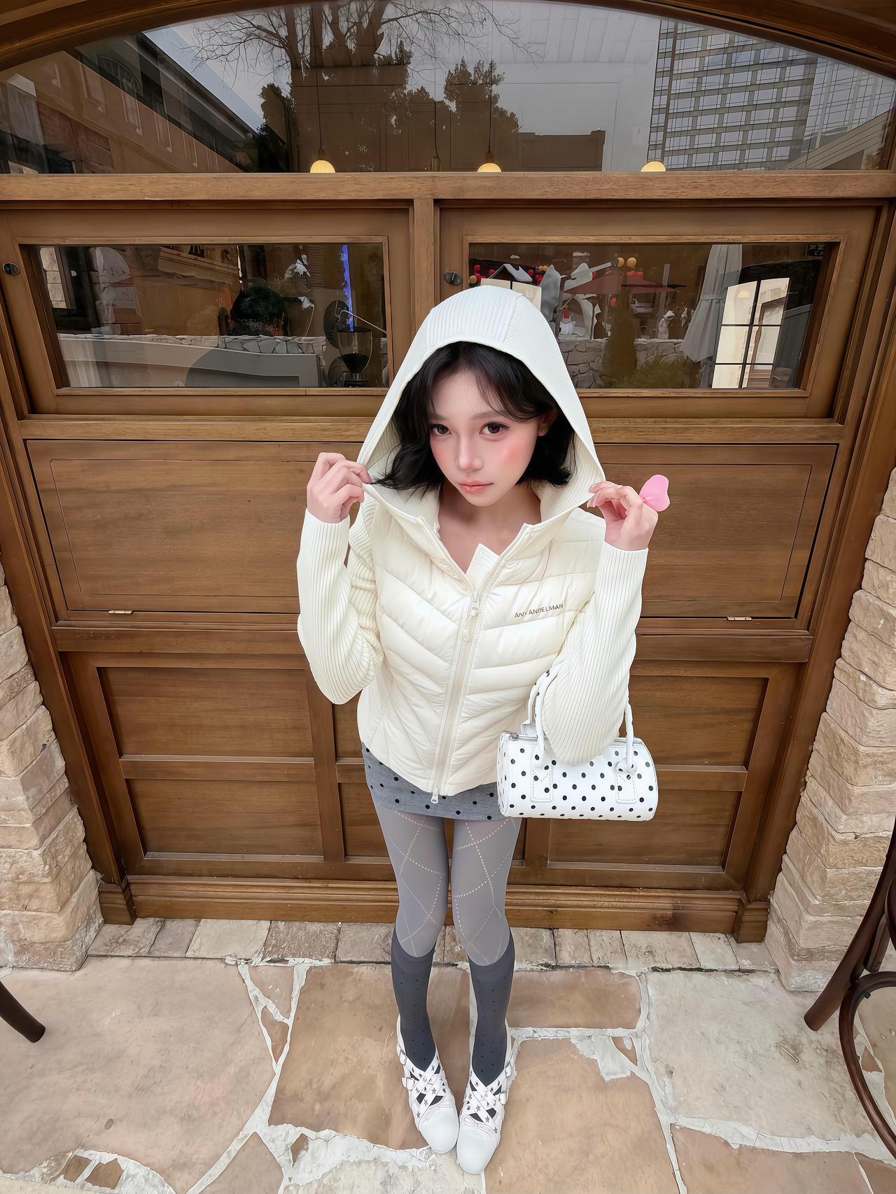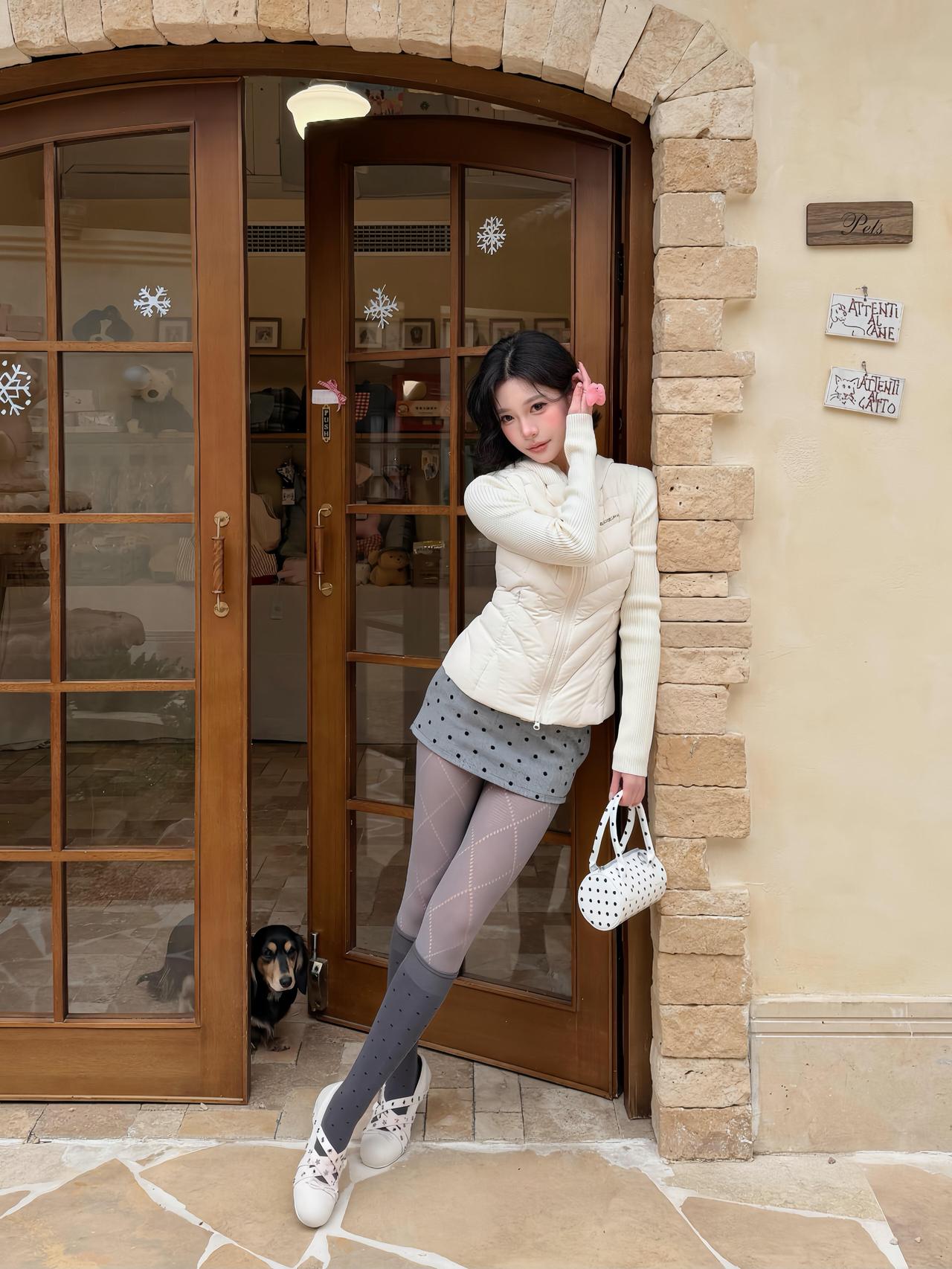 《冬日暖阳·少女行吟》 暖阳斜照石阶旁,古木门扉映日光。 少女轻盈步履忙,笑语盈盈入画堂。 身披素羽羽绒裳,洁白如雪映容光。 连帽轻拢护颈项,罗纹袖口显端庄。 内搭针织温且柔,修身剪裁显腰长。 下着短裙点点斑,灰蓝相间韵悠扬。 菱格丝袜透肌理,黑白交织意绵长。 足踏白靴缀银扣,轻盈如燕步生香。 手提波点小包囊,黑白分明意趣藏。 粉嫩发饰鬓边插,俏皮可爱胜春芳。 或倚门框或蹲坐,姿态万千任徜徉。 忽见萌犬摇尾至,亲昵依偎情意长。 绿植环绕添生气,冬日暖意满庭芳。 此情此景难描画,唯有诗篇记流光。 愿君常伴好时光,笑靥如花岁岁香。