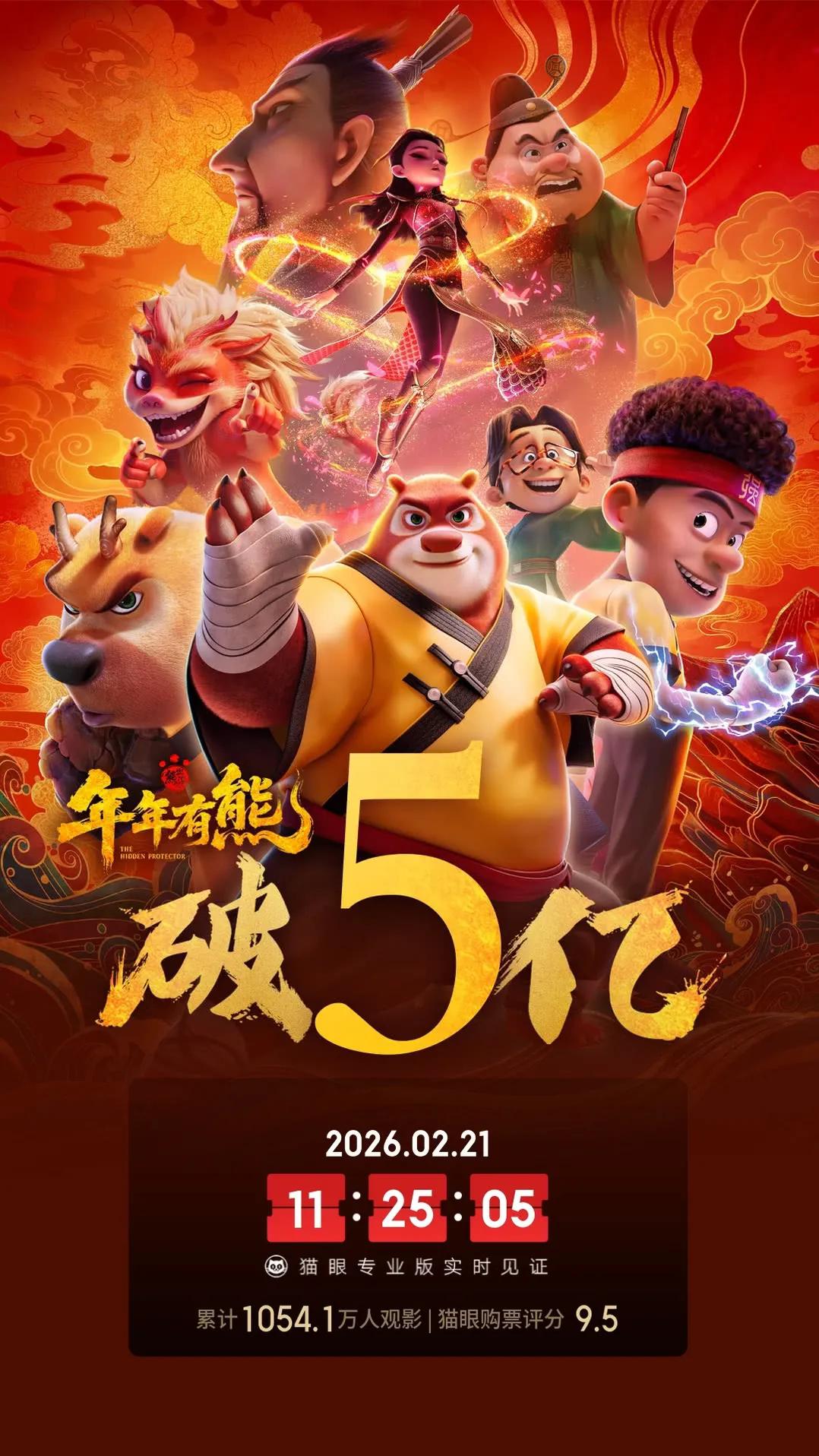 《熊出没·年年有熊》票房破5亿,没有《哪吒》也起色不大 由方特领衔出品的奇幻喜剧动画作品《熊出没·年年有熊》累计综合票房破5亿,即将成为2026春节档殿军。 从2022年到2024年,《熊出没》一年上一个台阶,2024年第10部的票房达到了19.84亿。尽管在票房修正退票数据后没能达到20亿,也已经是一个相当高的水平。2025年《熊出没》遭遇《哪吒2》,票房直接下滑到8亿多。2026年春节档不仅没有《哪吒》,真人电影的表现也一般,但《熊出没》票房起色不大,预估只有10亿出头。《熊出没》系列今后还有没有机会冲击20亿还是个未知数。熊出没