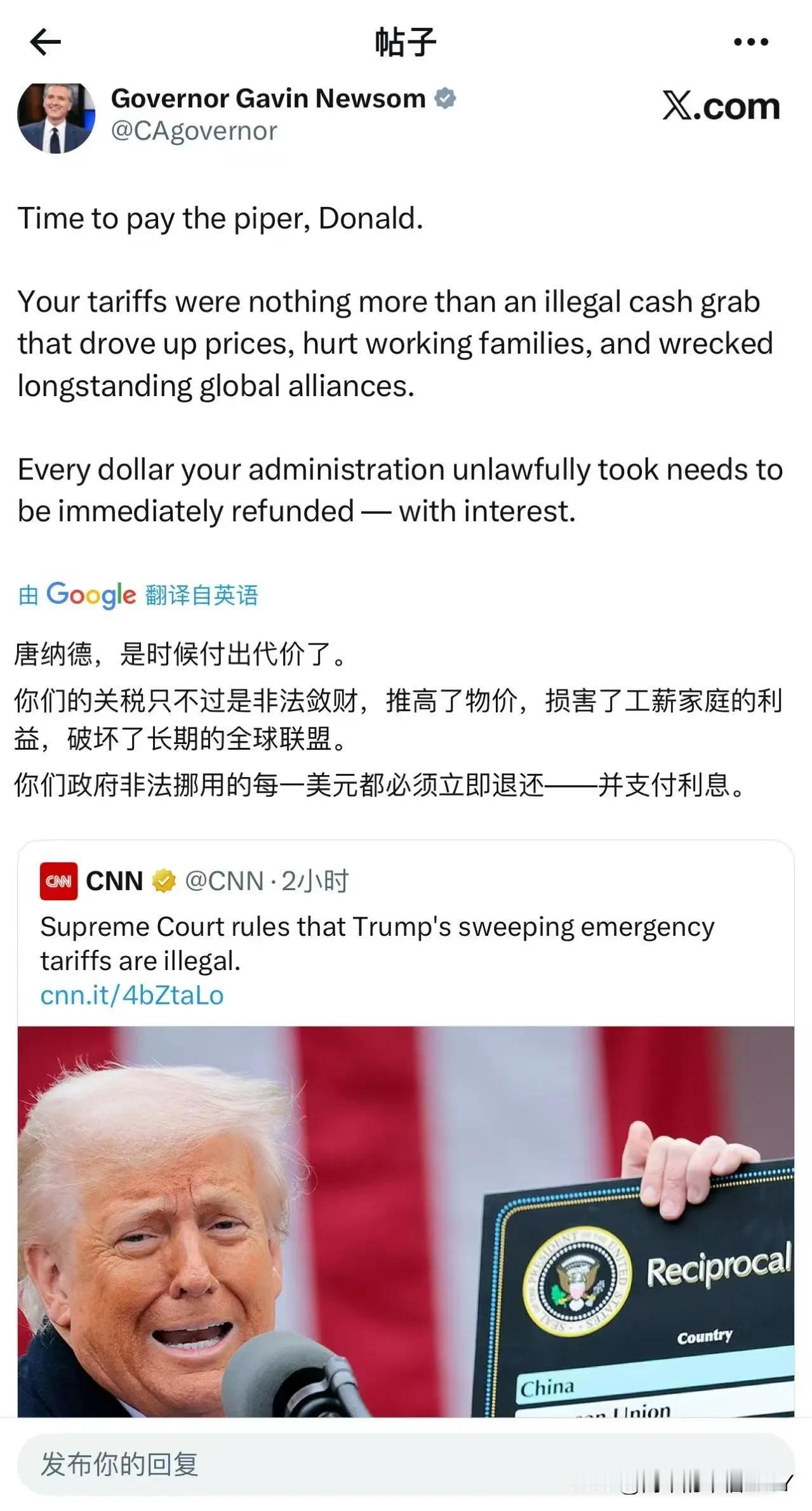 不管特朗普接下来怎么搞,美国最高法院的判决裁定,他之前的关税违法。这是终审裁决,不能上诉。 特朗普现在最挠头的是还钱,既然是违法征收,那收上来的钱就得一分不少退回去。加州州长纽森看得明白,在一旁“敲边鼓”:“唐纳德,该买单了。 这些关税就是非法捞钱,推高物价坑了工薪家庭,就为了你破坏联盟、敲诈勒索。每一分非法征收的钱,连本带利都得立刻还回来——赶紧掏钱!” 纽森确实有得意的资本,加州是美国第一大州,也是第一个敢跟特朗普政府叫板的,就为这关税的事把官司打到了法院。如今判决下来,狠狠打了特朗普的脸,这里面少不了加州的一份力。 可问题来了,那1750亿美元的关税,早被特朗普政府花得差不多了。现在不光要还本金,还得加上利息,这笔钱从哪儿来? 老话说“出来混迟早要还”,特朗普怕是没料到会有这么一天。当初靠着关税大棒四处挥舞,以为能拿捏别人,没想到给自己挖了这么大个坑。 那些被征来的钱,或许填了政府预算的窟窿,或许补贴了某些行业,可不管花到哪儿,现在都得一笔笔抠回来,还给那些当初被迫交钱的企业和国家。 这对美国财政来说,无疑是雪上加霜。本来就债台高筑,突然要掏出这么大一笔钱,难不成要靠印钞?可印多了钞票,物价涨得更凶,最后还是老百姓遭殃。 纽森说关税推高了物价,这话没假,现在还钱要是处理不好,怕是要再来一波连锁反应。那些当初被征收关税的企业,这会儿怕是又喜又愁。 喜的是钱能拿回来,愁的是不知道要等多久。特朗普政府要是磨磨蹭蹭,这笔钱能不能顺利到账都是未知数。就像借钱给无赖,好不容易赢了官司,对方却哭穷说没钱还,你能怎么办? 加州这步棋走得妙,早早就看出关税政策不对劲,敢第一个站出来起诉,既维护了本州企业的利益,也在全国面前挣了面子。这告诉我们,遇到不公不义,光抱怨没用,得拿起规则的武器。 可特朗普呢?面对还钱的压力,他会老老实实想办法吗?以他的性子,说不定又会耍新花样。要么找借口拖延,要么想别的法子筹钱,甚至可能把怨气撒到其他地方,搞出更多乱子。 但不管怎么耍花样,终审判决摆在那儿,想赖掉怕是没那么容易。这件事也给其他国家提了个醒:跟不讲规矩的人打交道,得留一手。 特朗普的关税政策说变就变,说征就征,如今被法院判违法,说明再横的人也得受规则管。只是这代价太大,1750亿美元的来去,多少企业跟着遭罪,多少贸易关系被打乱。 说到底,欠债还钱天经地义,哪怕是总统也不能例外。特朗普现在头疼的还钱难题,都是当初任性妄为埋下的雷。这雷炸了,不光他自己要扛,整个美国都得跟着受影响。 至于最后怎么还,或许得靠削减其他开支,或许得找新的税收来源,但不管怎么说,这1750亿美元加利息,终究是要从美国的口袋里掏出去。 这也算是给特朗普上了一课:权力再大,也大不过法律;算计再精,也躲不过因果。